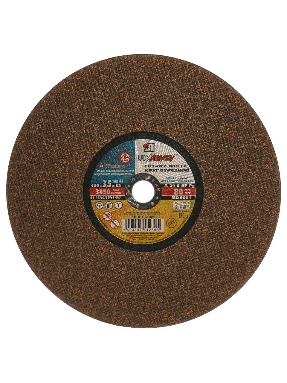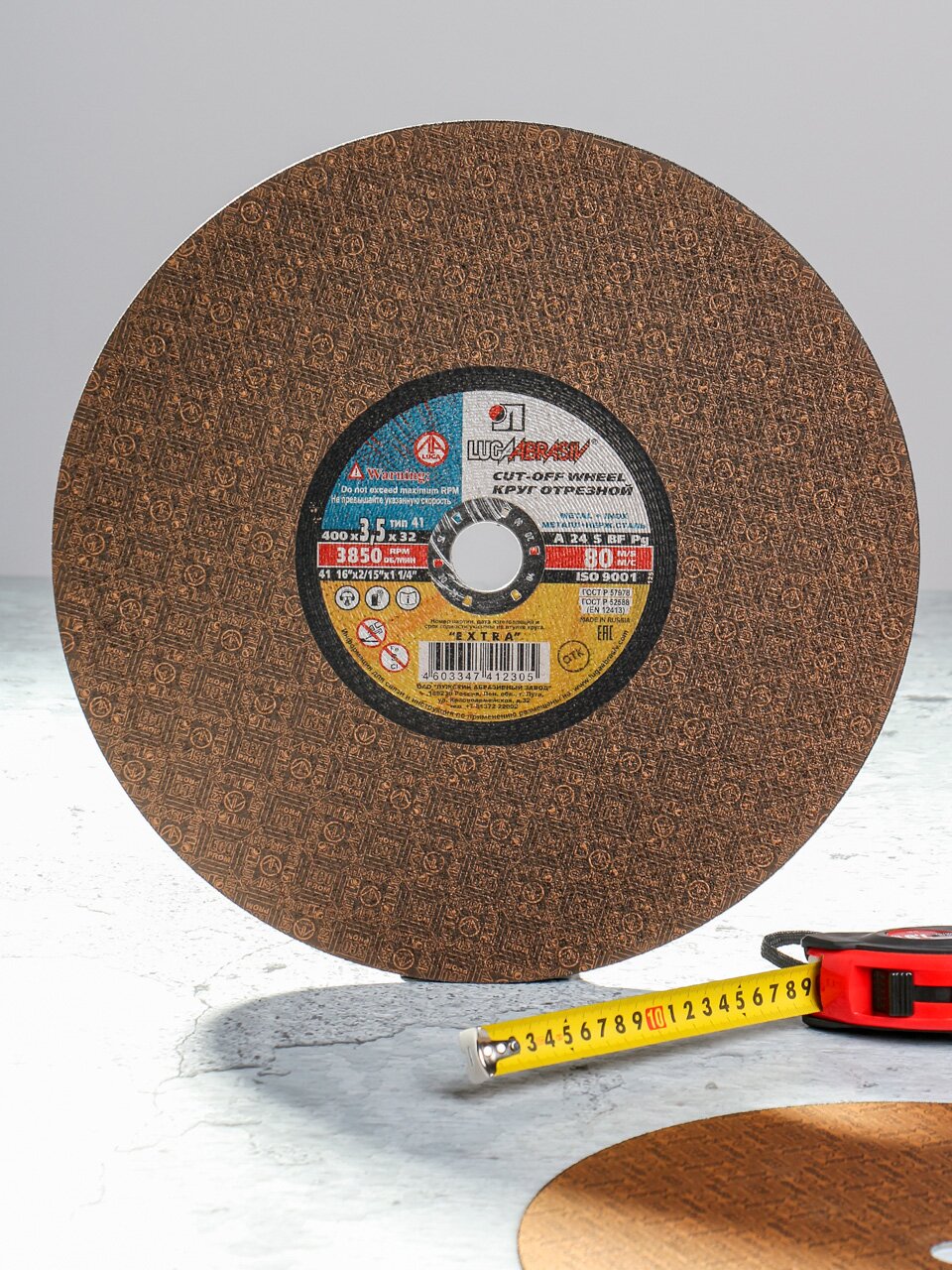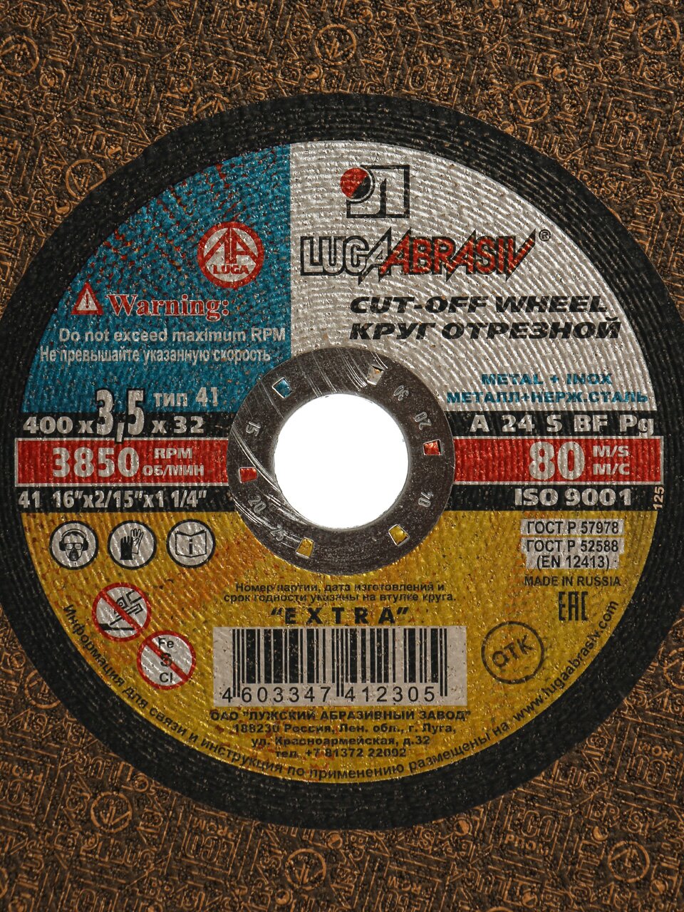 Для толстых металлических заготовок оптимален круг диаметром 400 мм, толщиной 3.5 мм, зерно A24, посадка 32 мм — как у данной модели LugaAbrasiv Extra.