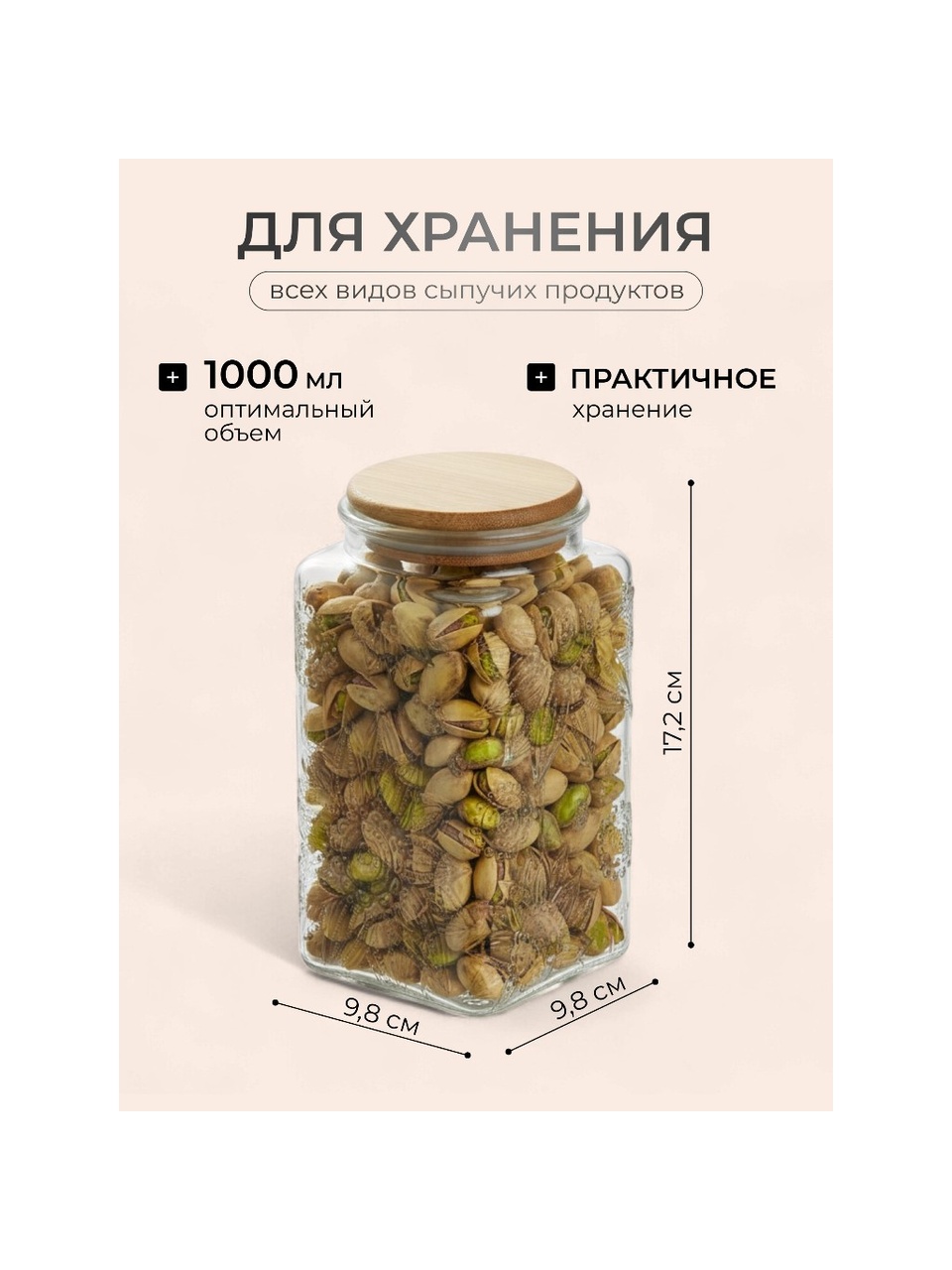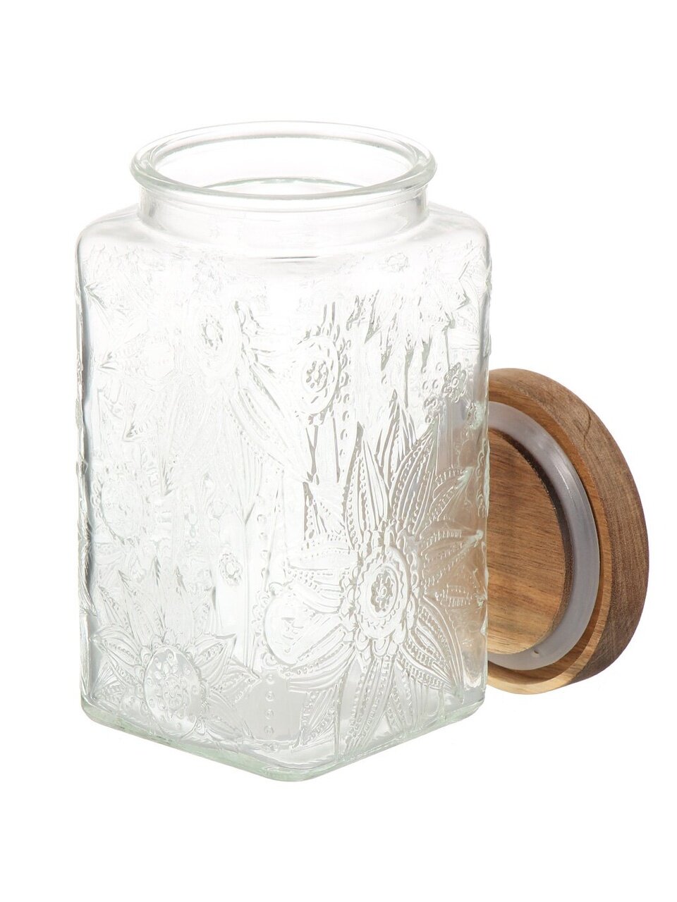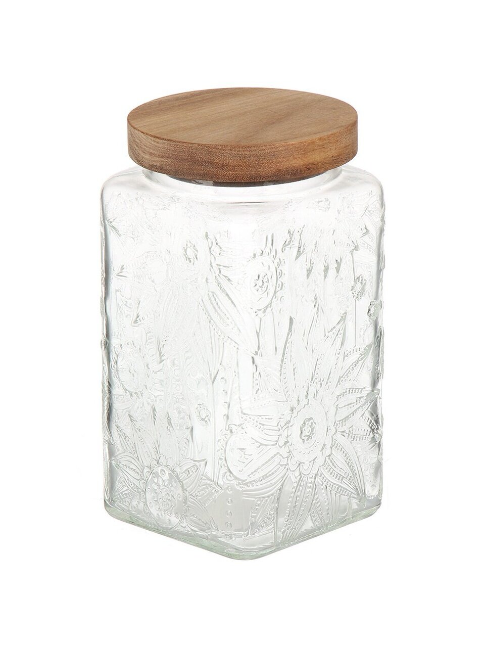 Объём — 1 литр, размеры: длина и ширина 9.8 см, высота 17.2 см; форма — квадратная, крышка из дерева, прозрачное рельефное стекло.