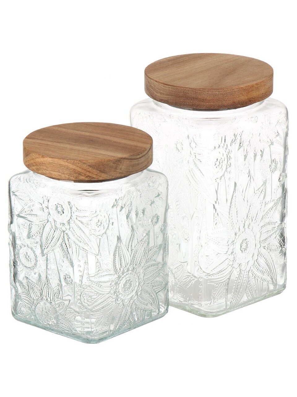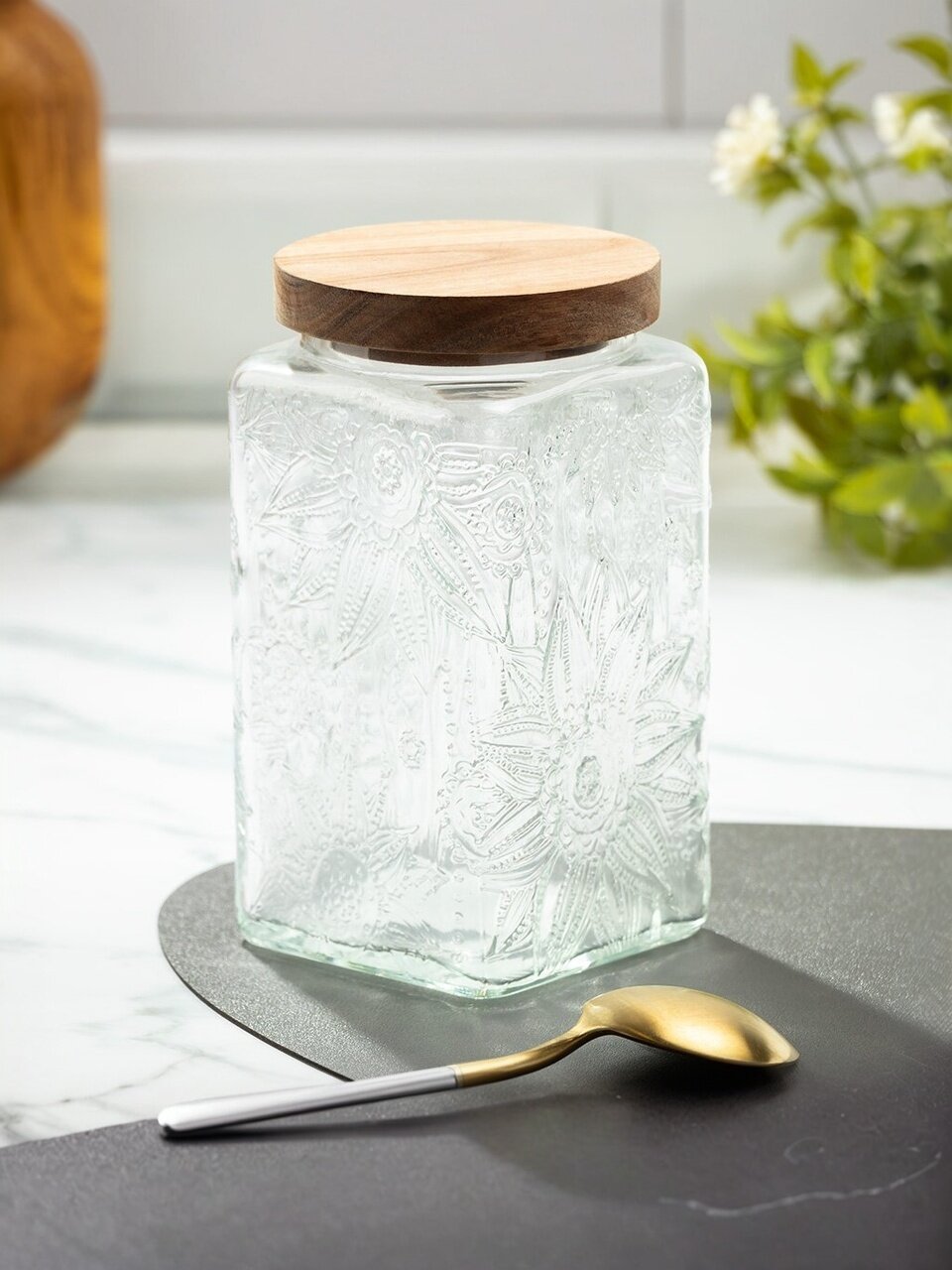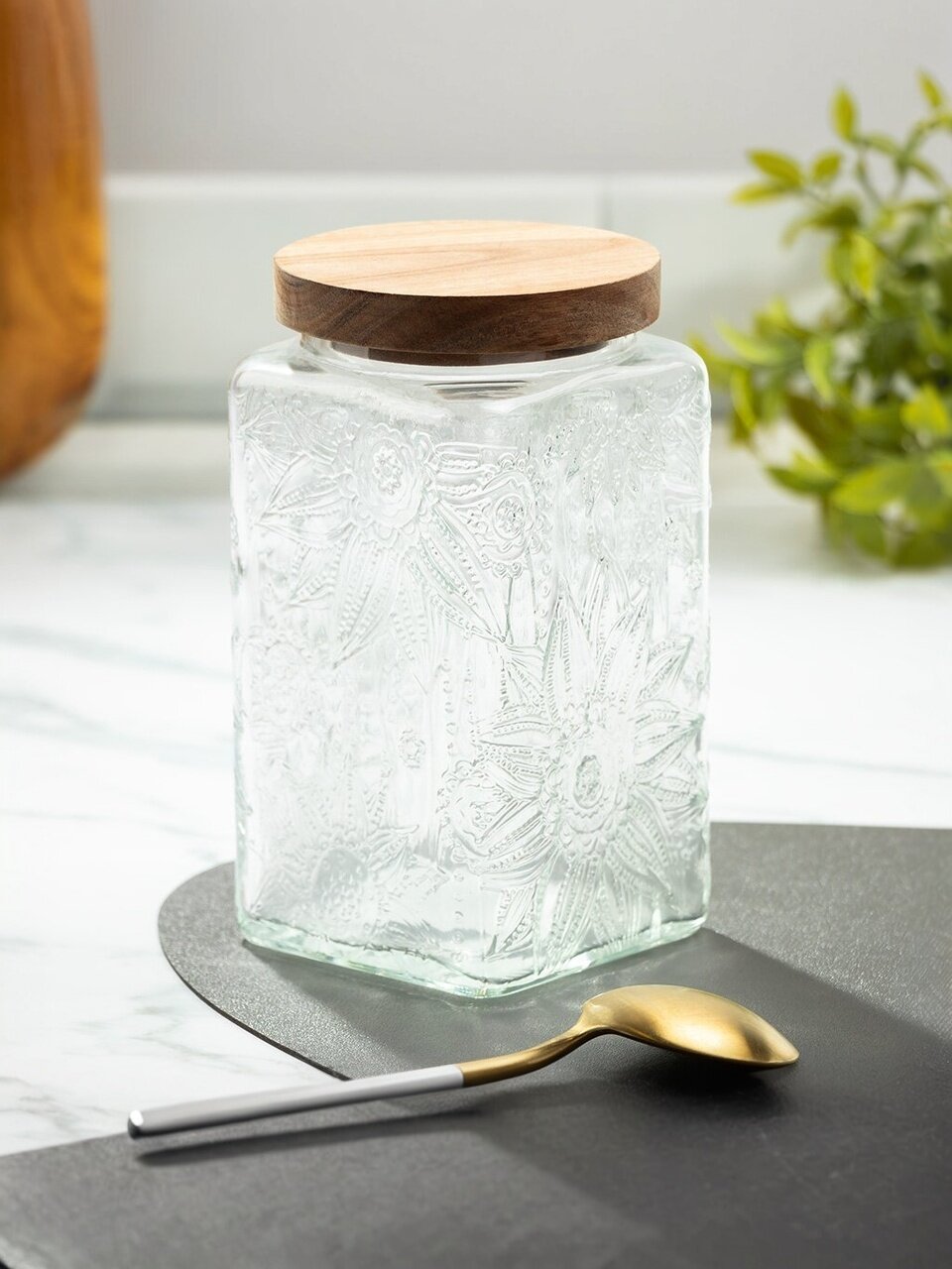 Объём — 1 литр, размеры: длина и ширина 9.8 см, высота 17.2 см; форма — квадратная, крышка из дерева, прозрачное рельефное стекло.