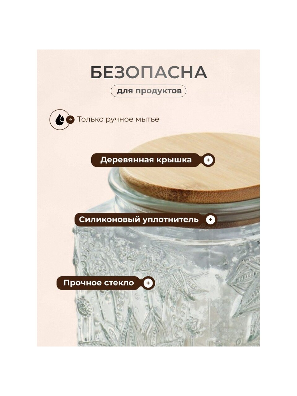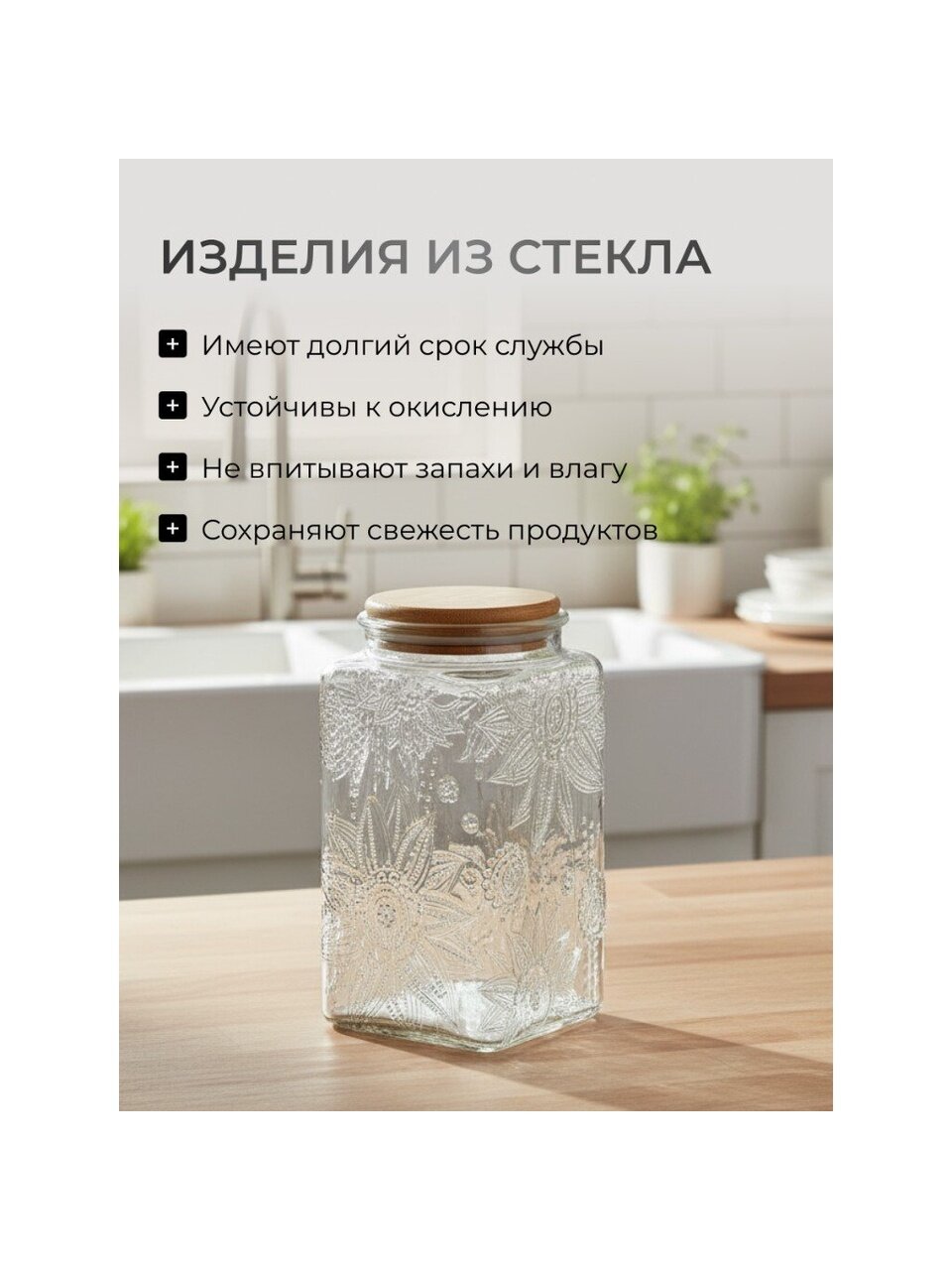 Если вы ищете, чем отличается эта банка от пластиковых или металлических контейнеров, — стекло не вступает в реакцию с продуктами, не окрашивается и не деформируется со временем. Подходит ли для хранения на даче? Да, прочное стекло и плотная крышка сохранят свежесть даже при перепадах температуры. Можно использовать для сахара, соли, орехов, специй, а стильный дизайн впишется в любой интерьер от кухни до загородного дома.