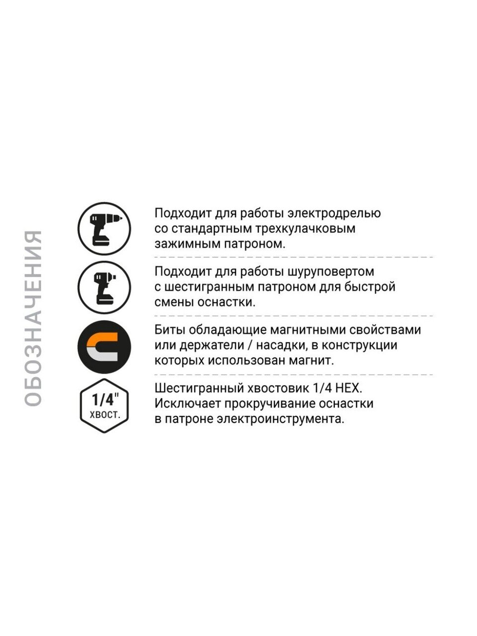 - Шестигранный хвостовик 1/4" HEX обеспечивает надежное крепление оснастки в патроне электроинструмента, предотвращая ее проскальзывание.