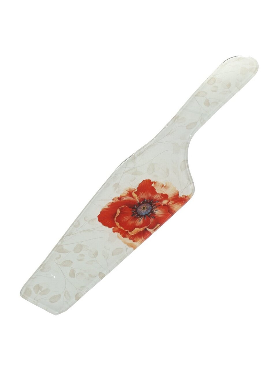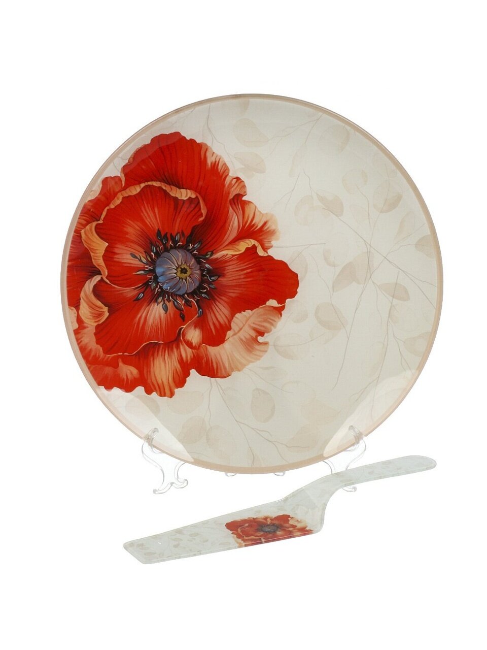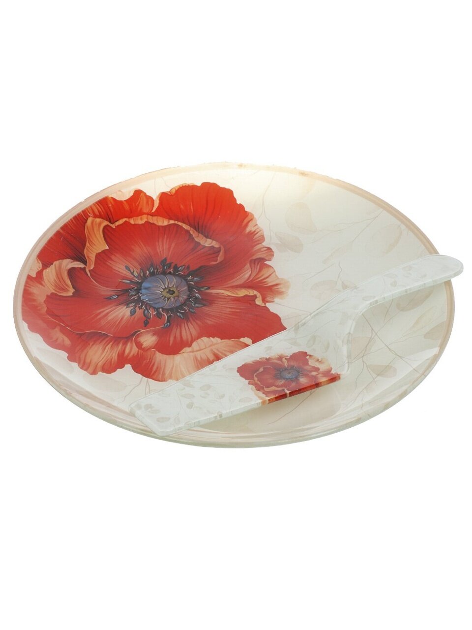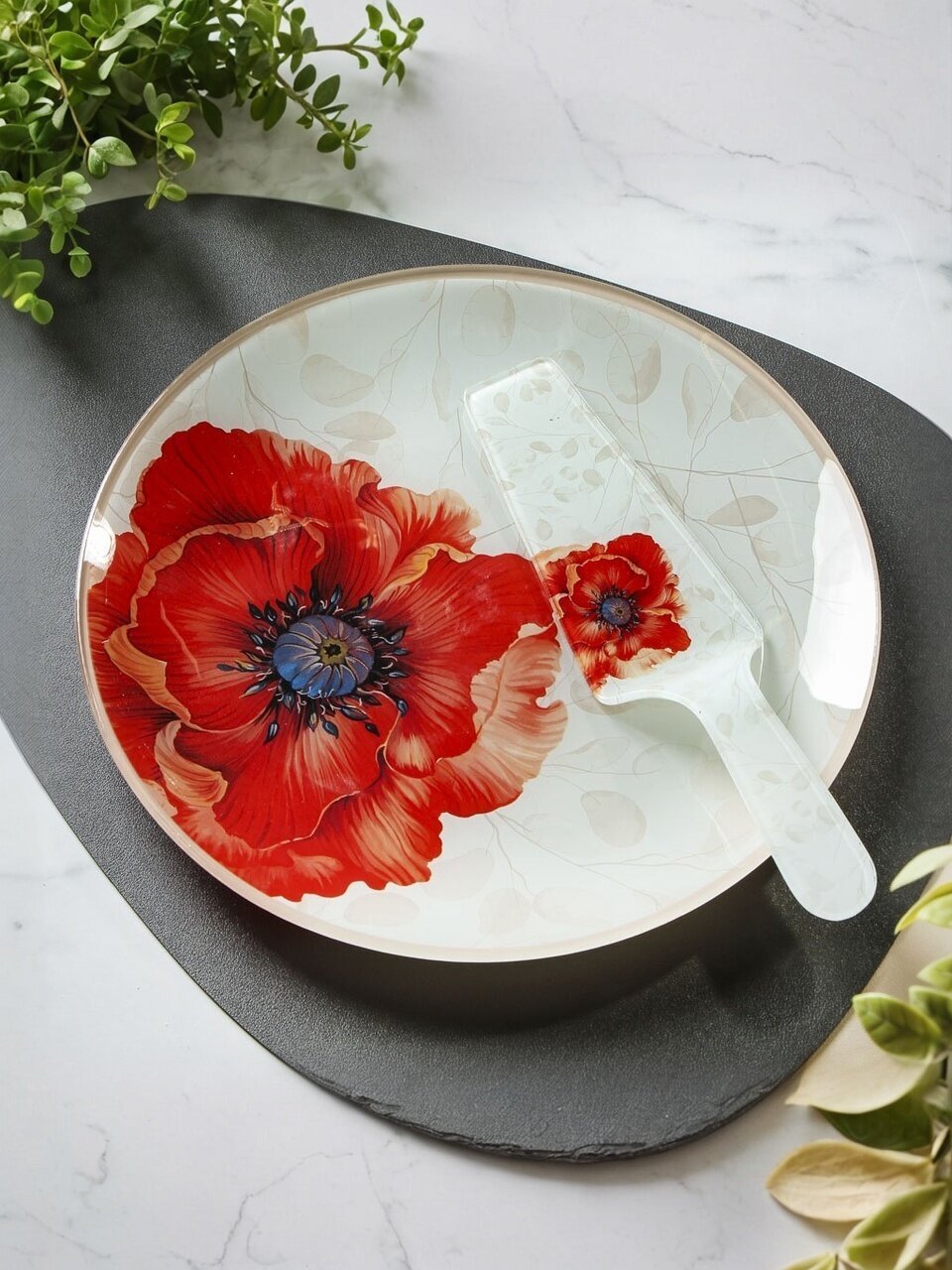 - Уникальный набор: стеклянное блюдо с ярким рисунком мака и удобная лопатка для подачи