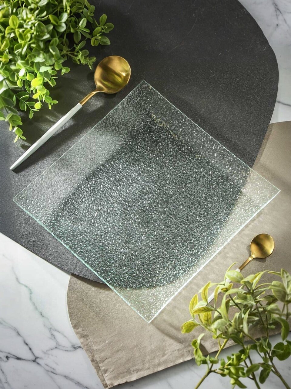 Стильное квадратное блюдо из стекла 25х25 см «Лед пузырьки»: эффектная сервировка, безопасность в посудомойке и СВЧ, универсальный подарок для дома и дачи.