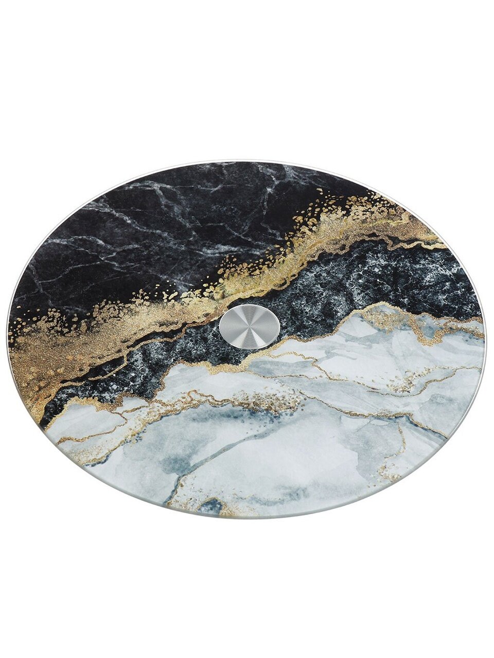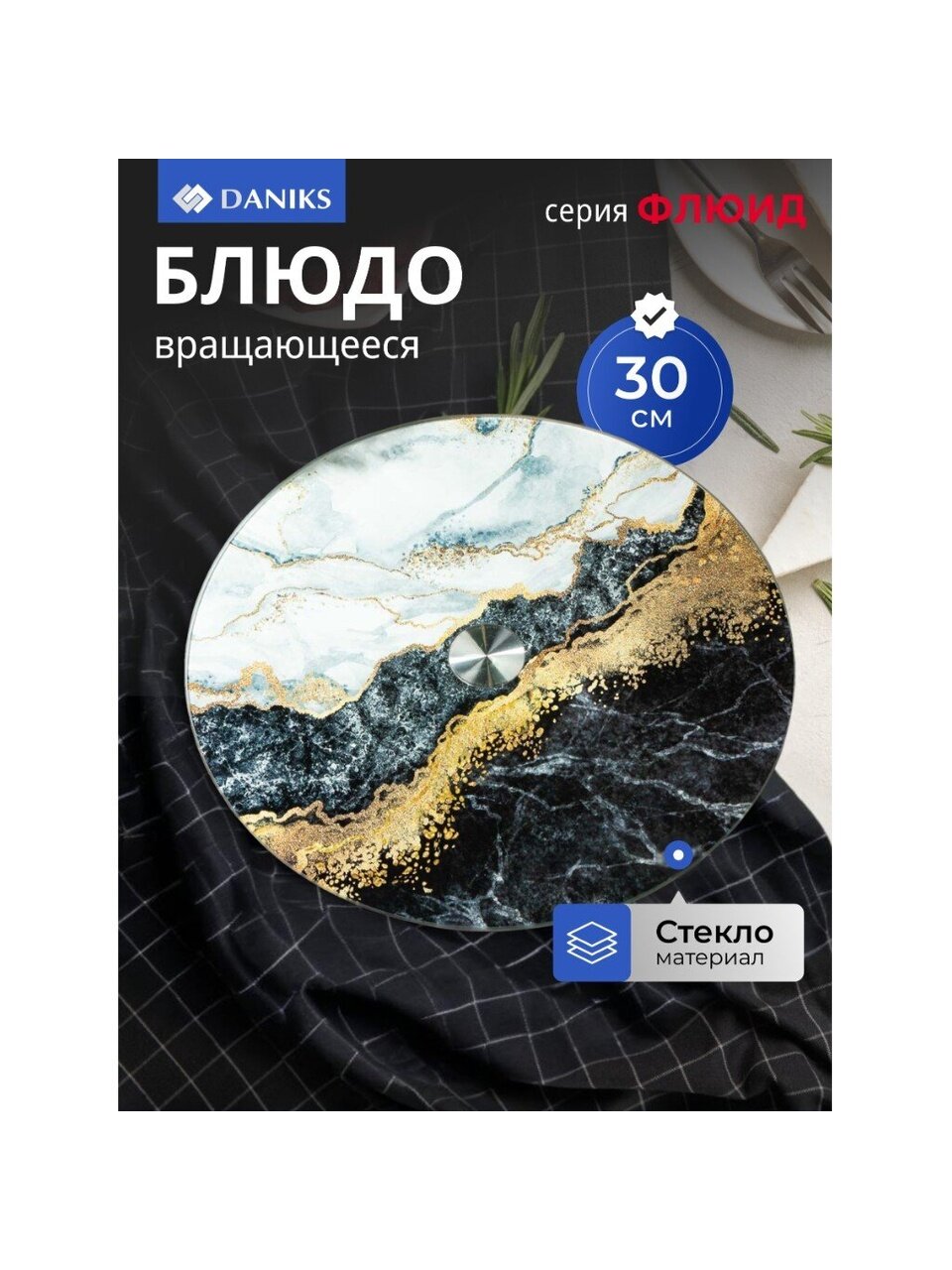 Круглое стеклянное блюдо Daniks Флюид 30 см — стильный акцент для сервировки, вращающееся основание, черный мраморный дизайн. Идеально для подарка и праздников.