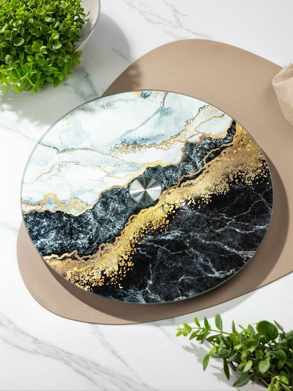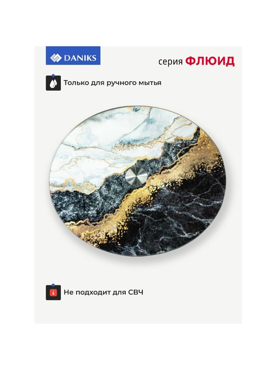 - Диаметр 30 см, прочное стекло с мраморным рисунком — эффектно смотрится на любом столе, подходит для сервировки на 4-6 персон
