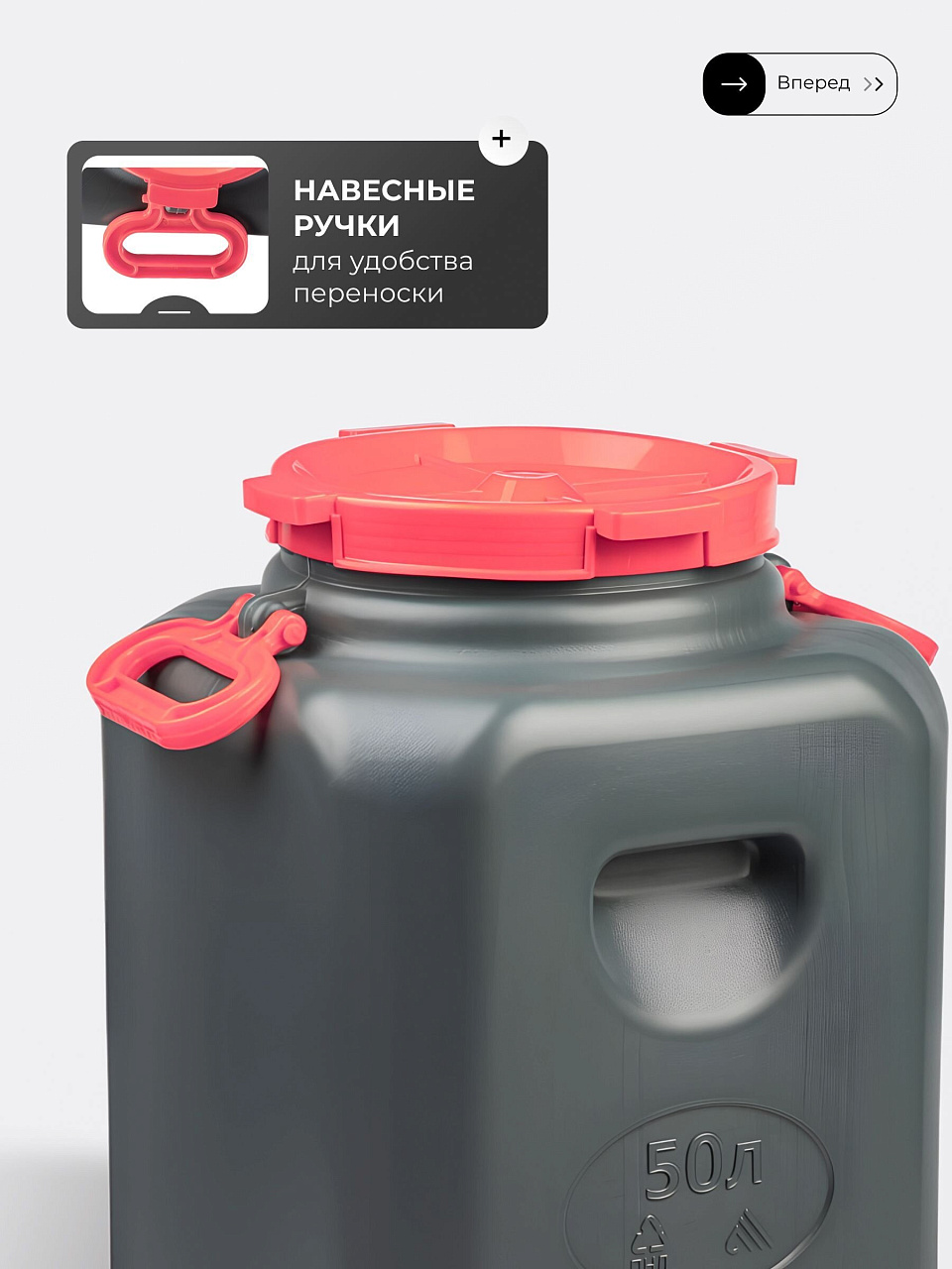 - Вместимость 50 литров, прочный пластик, диаметр горловины 215 мм для удобной заливки и очистки