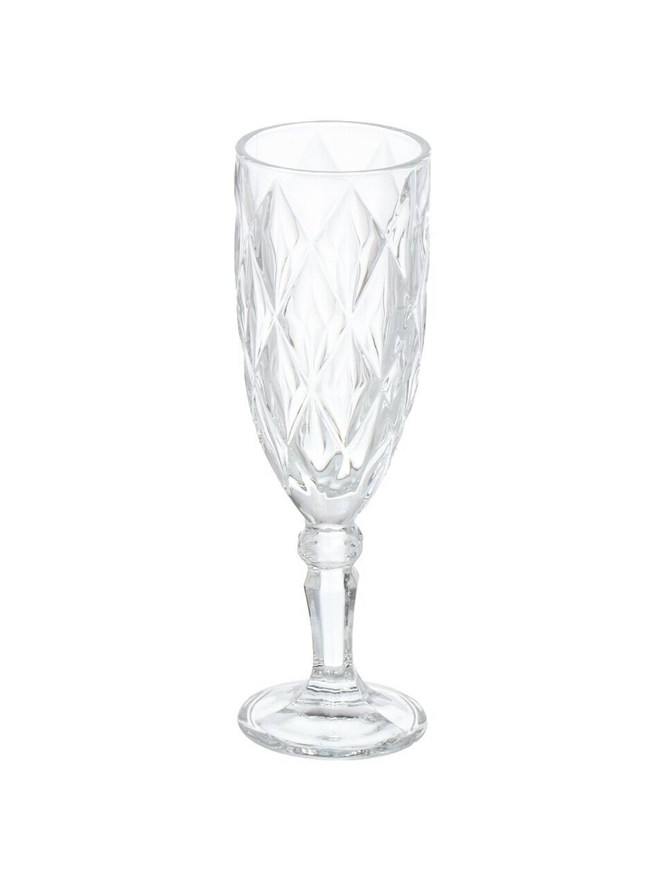 Объем одного бокала — 165 мл, форма — классическая флютте (узкая и высокая), материал — прозрачное рельефное прессованное стекло.