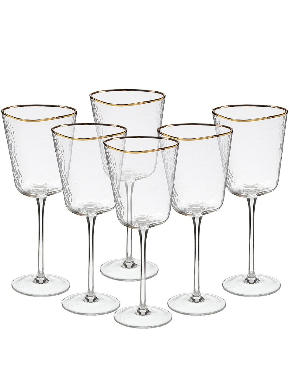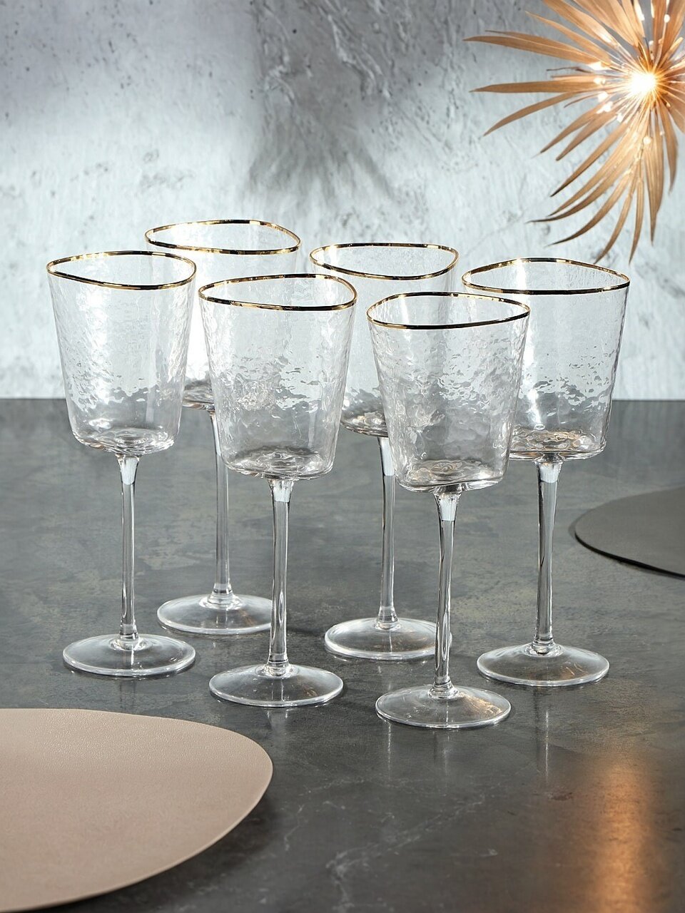 Если вы ищете, какие бокалы выбрать для подарка или чем отличаются бокалы с золотой отводкой от обычных стеклянных, обратите внимание на этот набор: рельефная текстура и декоративная отделка делают его заметно более презентабельным. В отличие от стандартных бокалов, эти смотрятся дороже, подходят для сервировки на особые случаи и не требуют сложного ухода (рекомендуется ручная мойка). Оптимальный объем 350 мл универсален для белого и красного вина, а набор из 6 штук — удачное решение для семьи или небольшой компании.