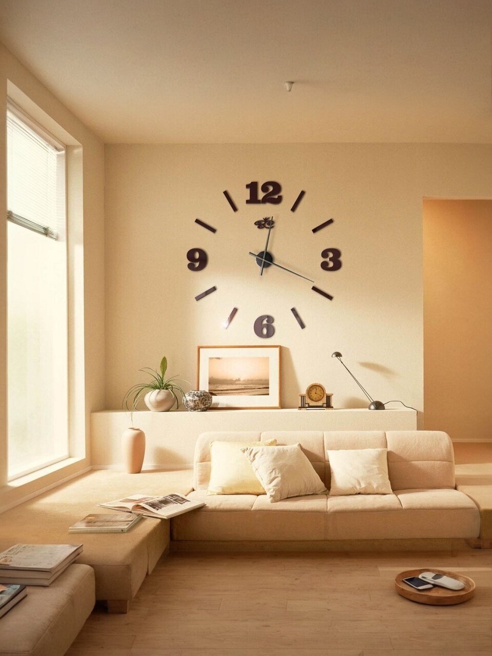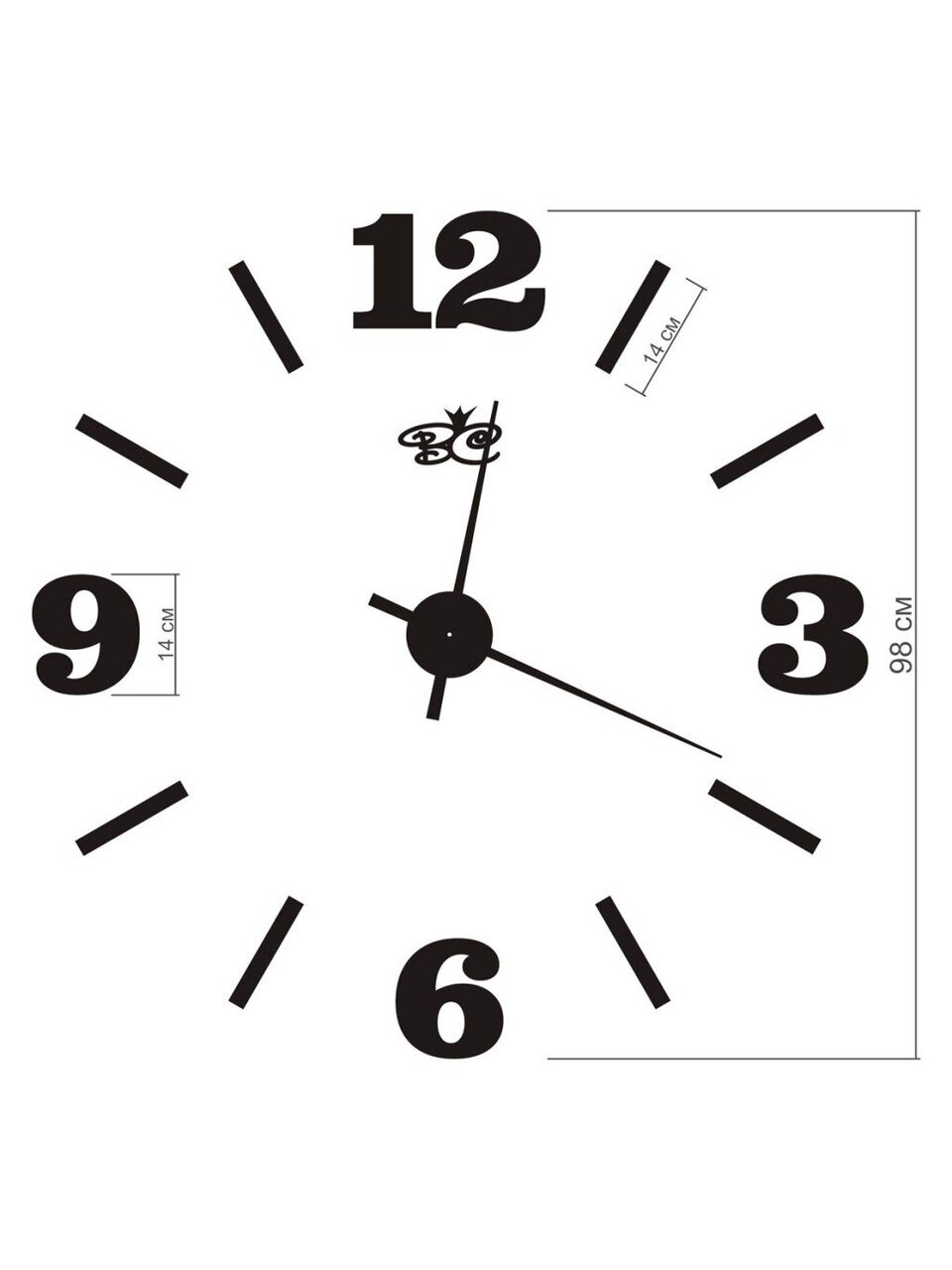Рекомендованный размер производителя от 90 до 100 см, но окончательное решение за покупателем. Минутная стрелка - 45 см. Часовая - 39 см. Точность хода +-1 сек в сутки. При установке не нужно сверлить стены и не нужны инструменты - все в комплекте для быстрой и точной установки. Все декоративные элементы уже на самоклеющейся основе (не нужен двухсторонний скотч) "Запас хода" обычной батарейки 8-9 месяцев. Время установки до 1 часа.
