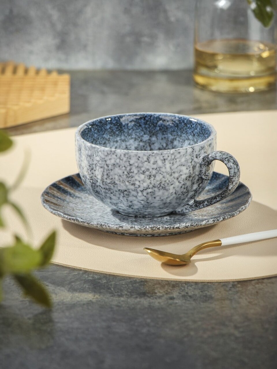 Чайная пара "Затмение" выполнена из высококачественной керамики, которая обеспечивает долговечность и приятные тактильные ощущения. Серый цвет и изысканный узор добавляют утонченности и современности, делая каждое чаепитие особенным. Круглая форма блюдца подчеркивает гармонию и завершенность дизайна.