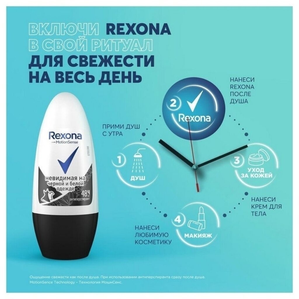 Антиперспирант Rexona специально разработан для того, чтобы обеспечить самую современную защиту от пота и запаха, каким бы насыщенным ни был день. Он создан с использованием инновационной технологии Motionsense. Уникальные микрокапсулы, нанесенные на поверхность кожи, раскрываются во время движения под действием трения, высвобождая бодрящий аромат.