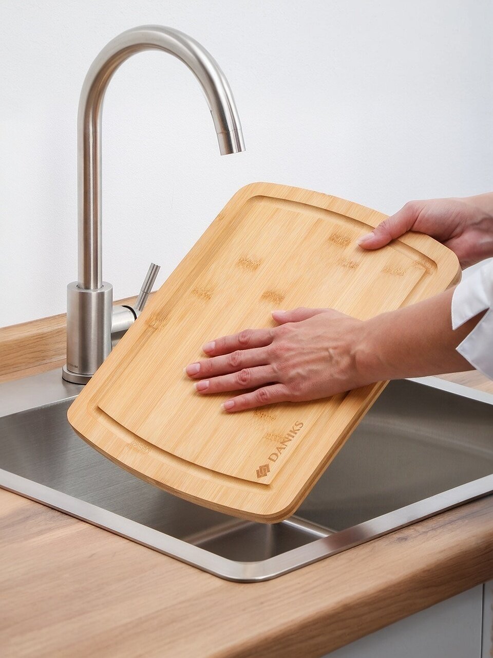Разделочная доска из бамбука - это незаменимый аксессуар на любой кухне. Она изготовлена из натурального бамбука, обеспечивающий длительный срок эксплуатации изделий. В отличие от других досок (пластик, бук или береза) эта доска не только легко моется и не скапливает бактерии, но и не расслаивается при регулярном использовании.