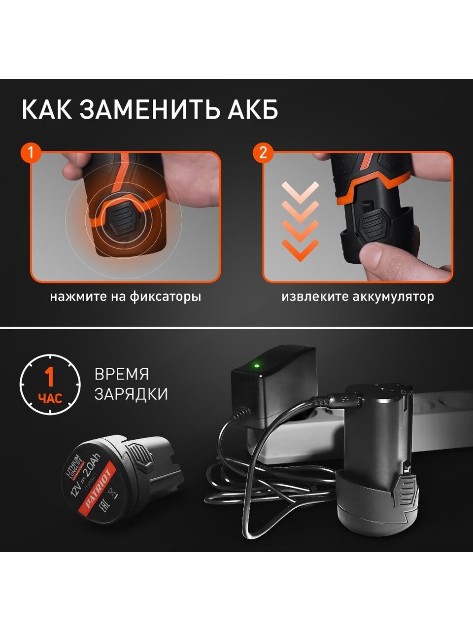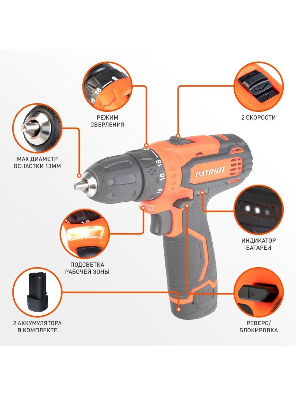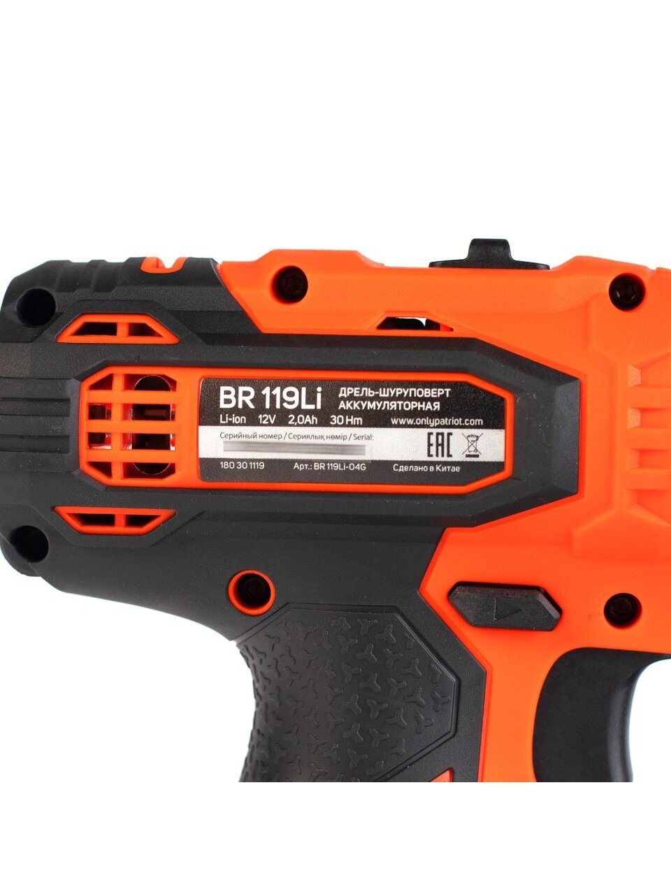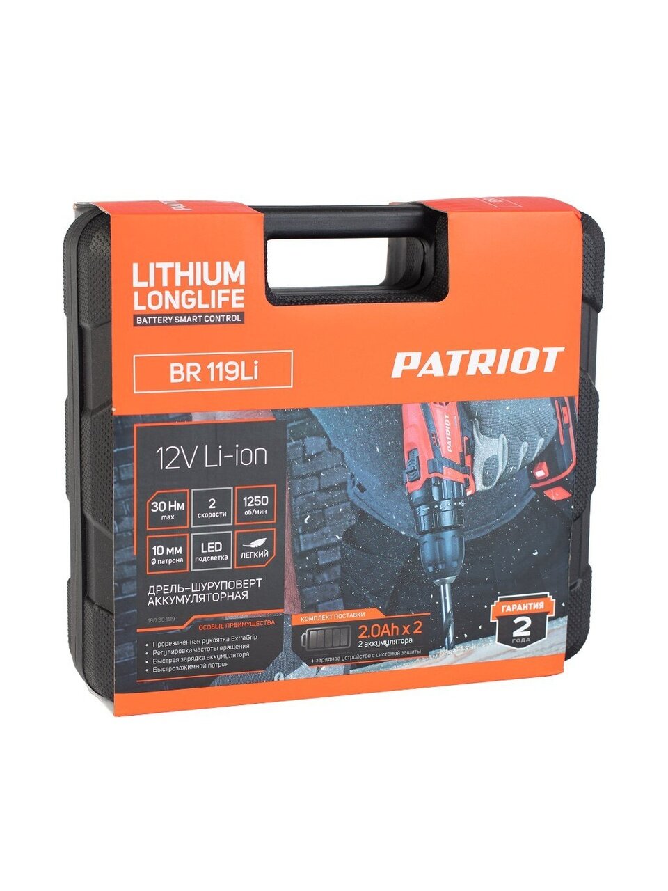 Patriot BR 119Li - это надежный и удобный шуруповерт, предназначенный для широкого спектра задач. Благодаря мощному мотору и быстрозажимному патрону, он легко справляется как с закручиванием крепежа, так и со сверлением отверстий в различных материалах.