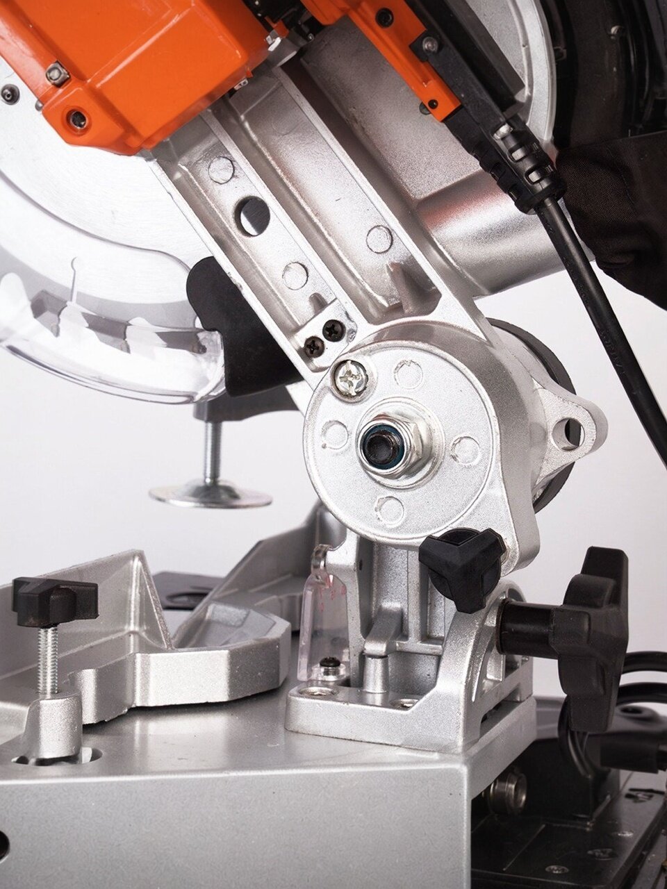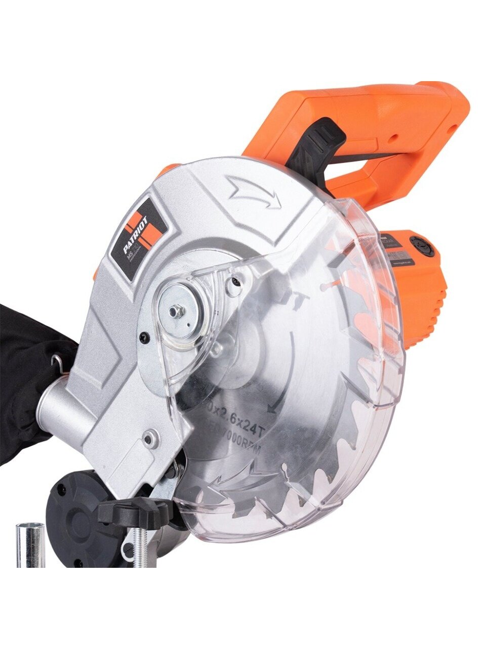 - Блокировка шпинделя облегчает процесс замены пильных дисков без необходимости демонтажа защитного кожуха.