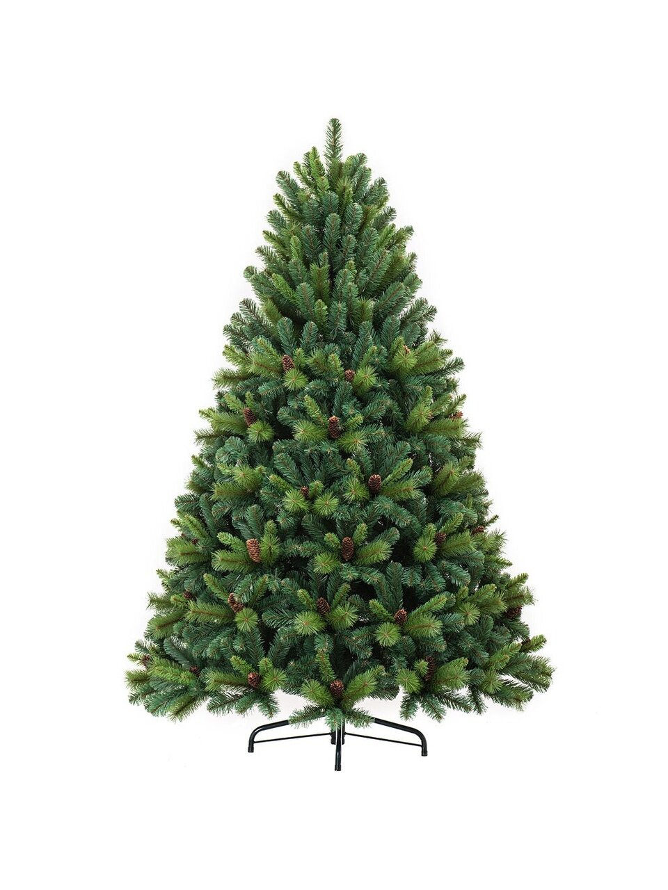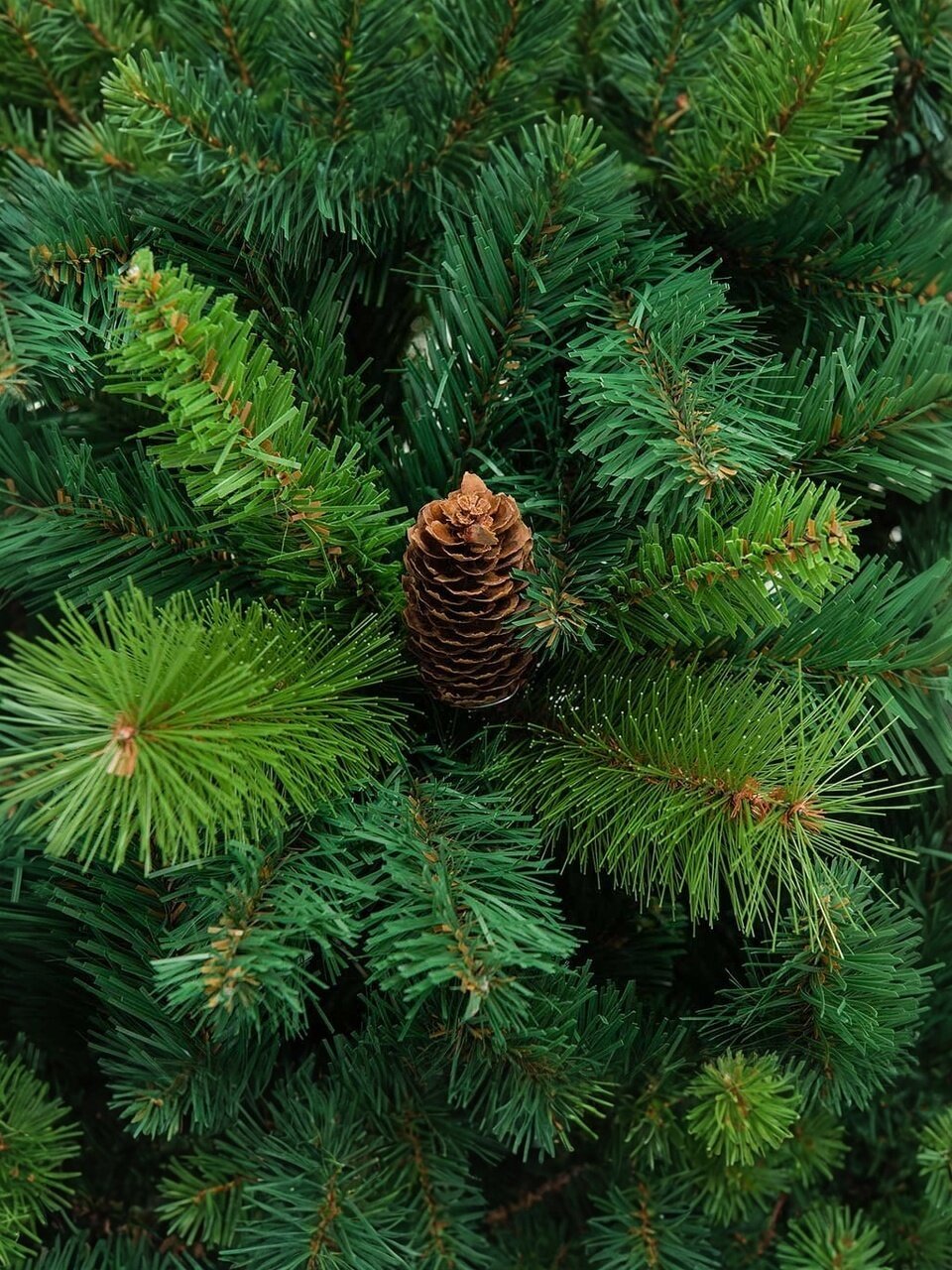 - Максимально натуральный вид — хвоя из лески и ПВХ, декор с шишками, плотная крона