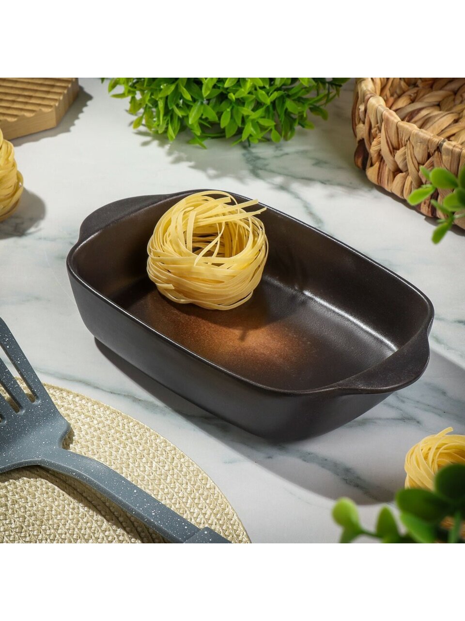 - Оптимальный размер 24×13,5×4,5 см и объём 0,58 л — удобно для порционных запеканок, пирогов, мяса и рыбы