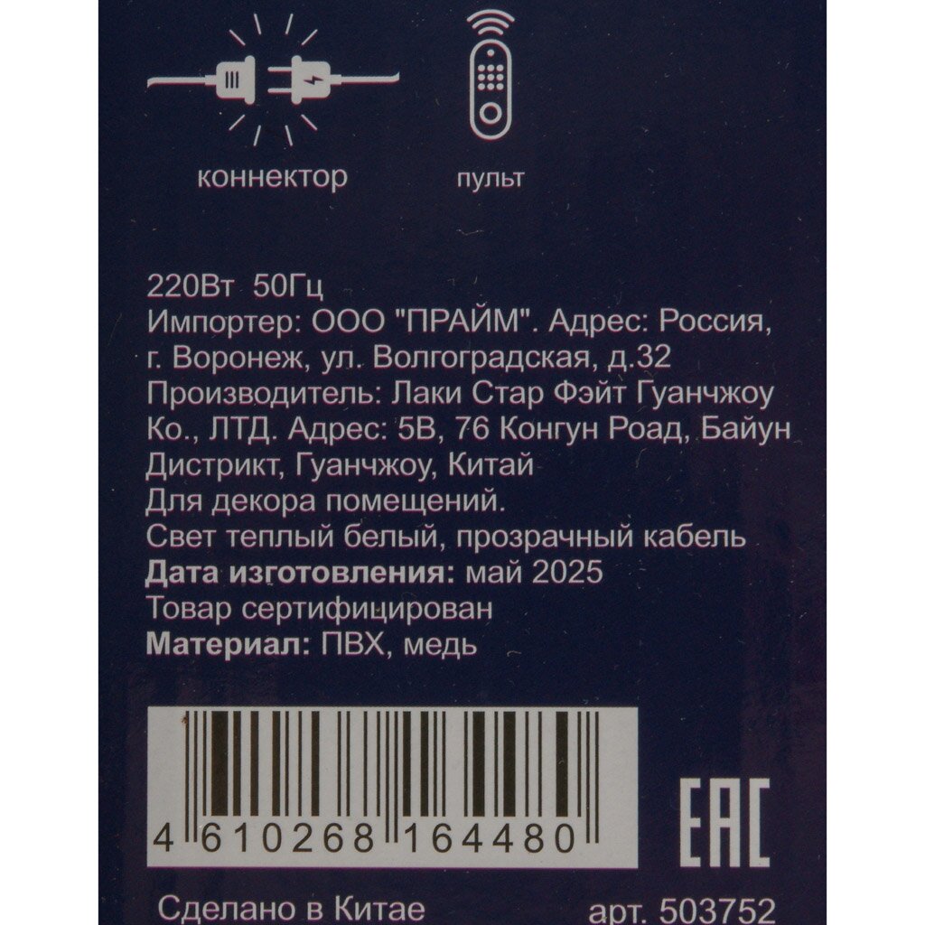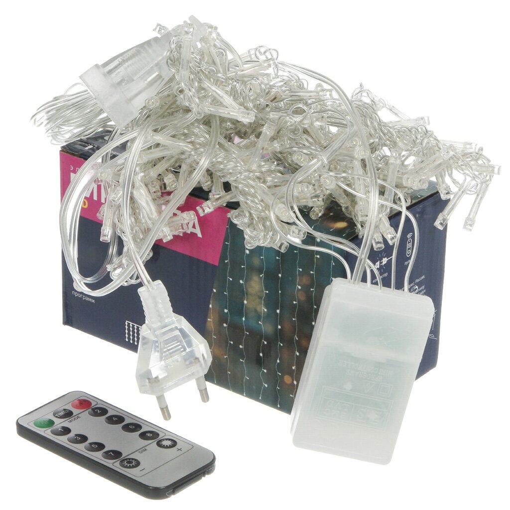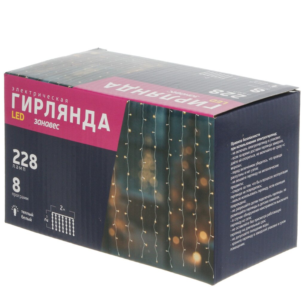 Гирлянда 228ламп, 2х2 м, 8 реж, Занавес, свет тепл бел, прозрач, сет, пульт, LED