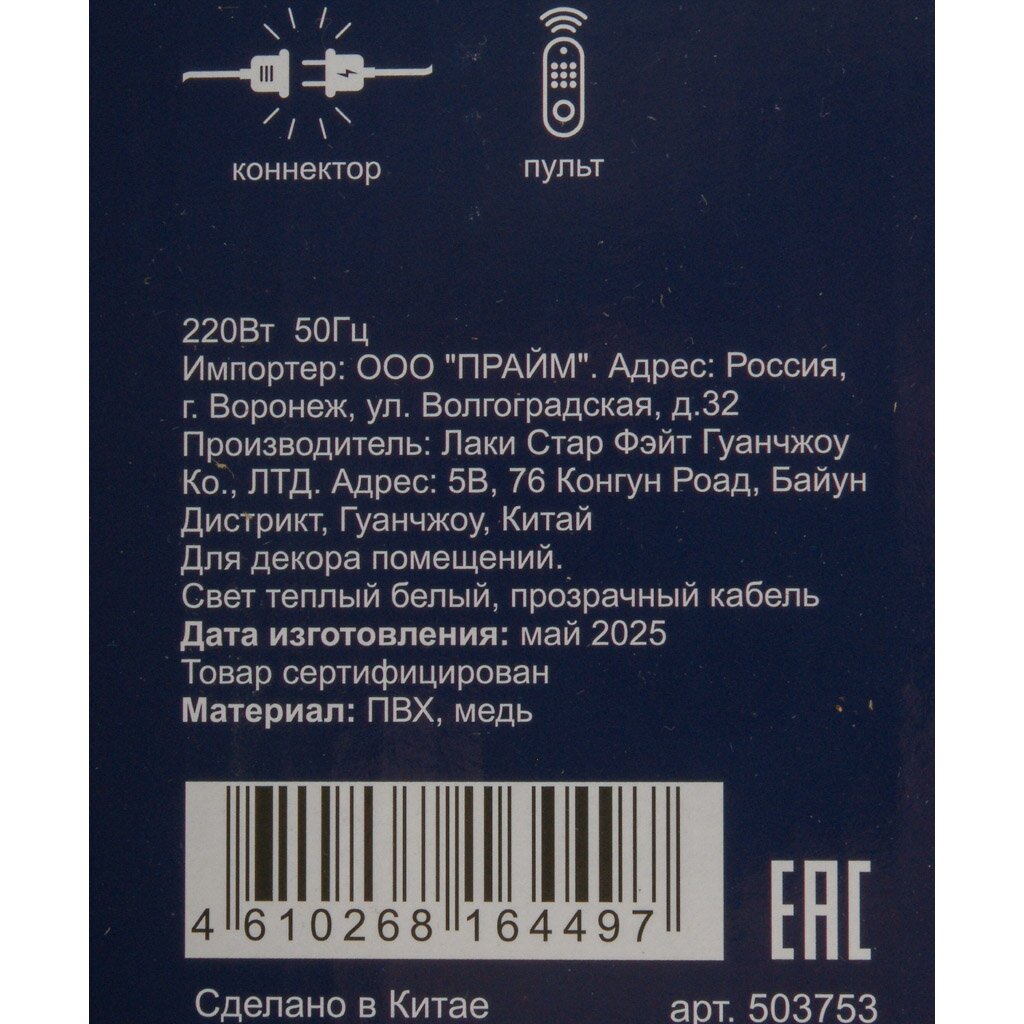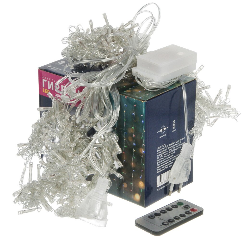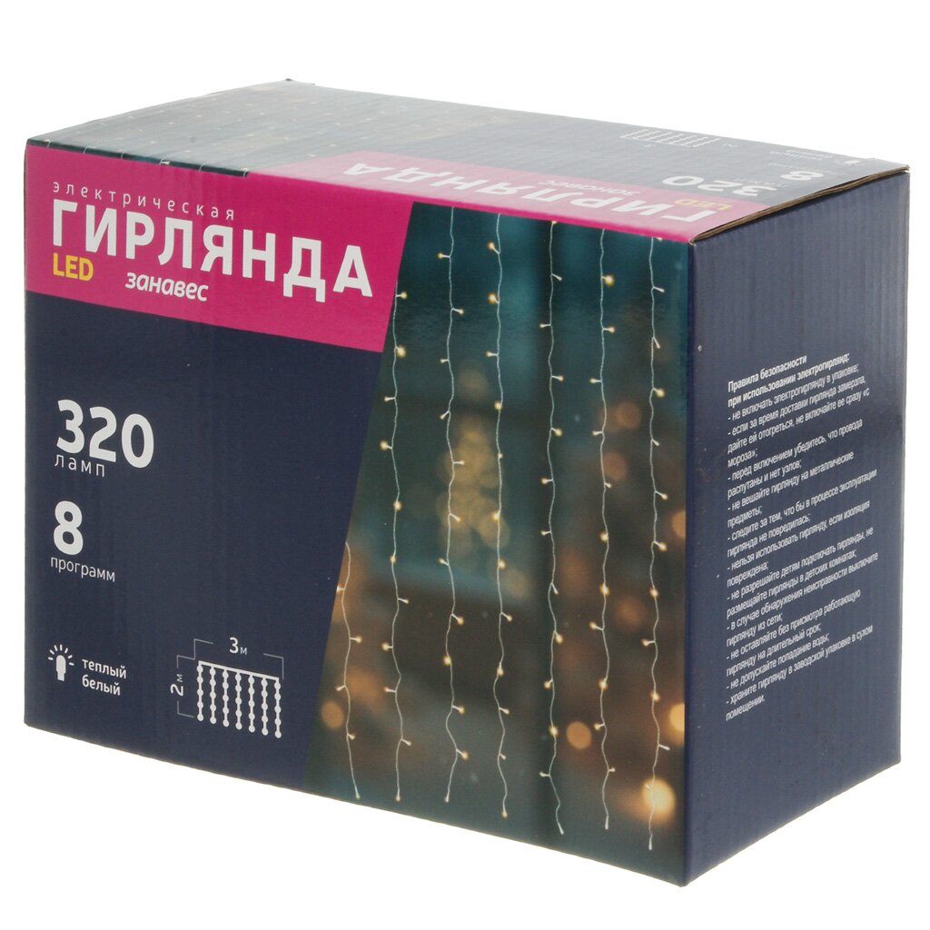 Гирлянда 320ламп, 3х2 м, 8 реж, Занавес, свет тепл бел, прозрач, сет, пульт, LED