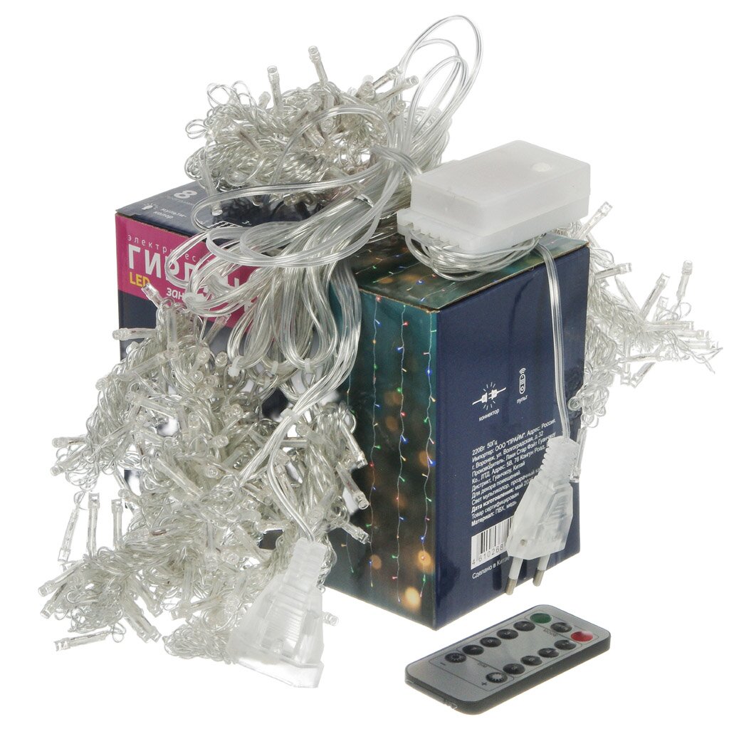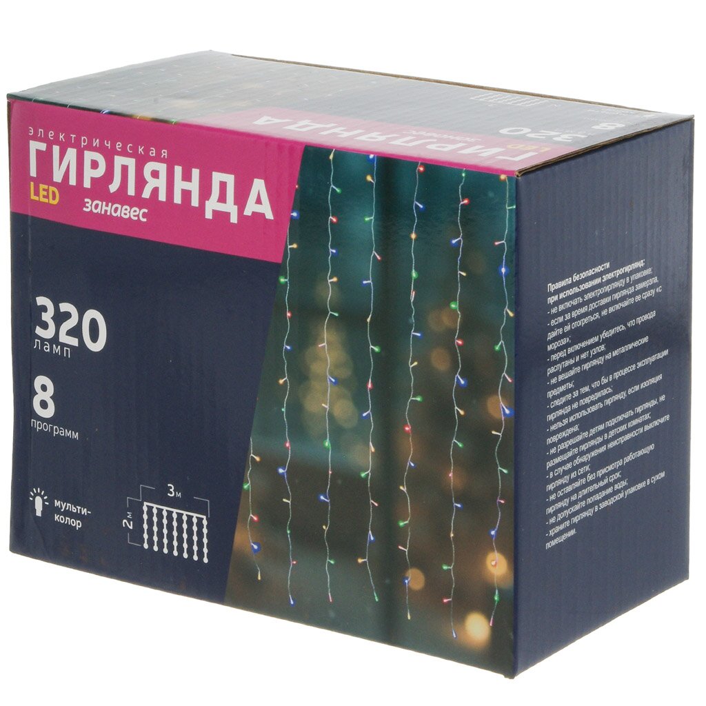 Гирлянда 320ламп, 3х2 м, 8 реж, Занавес, св мультикол, прозрач, сет, пульт, LED