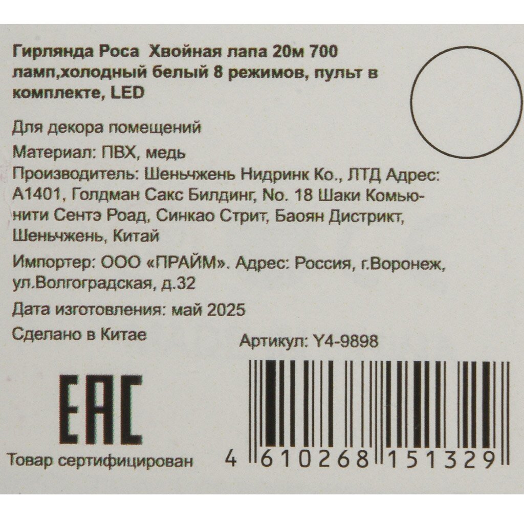 Гирлянда Роса, 700 ламп, 20 м, Хвойная лапа, холодный белый, 8 режимов, пульт, Y4-9898