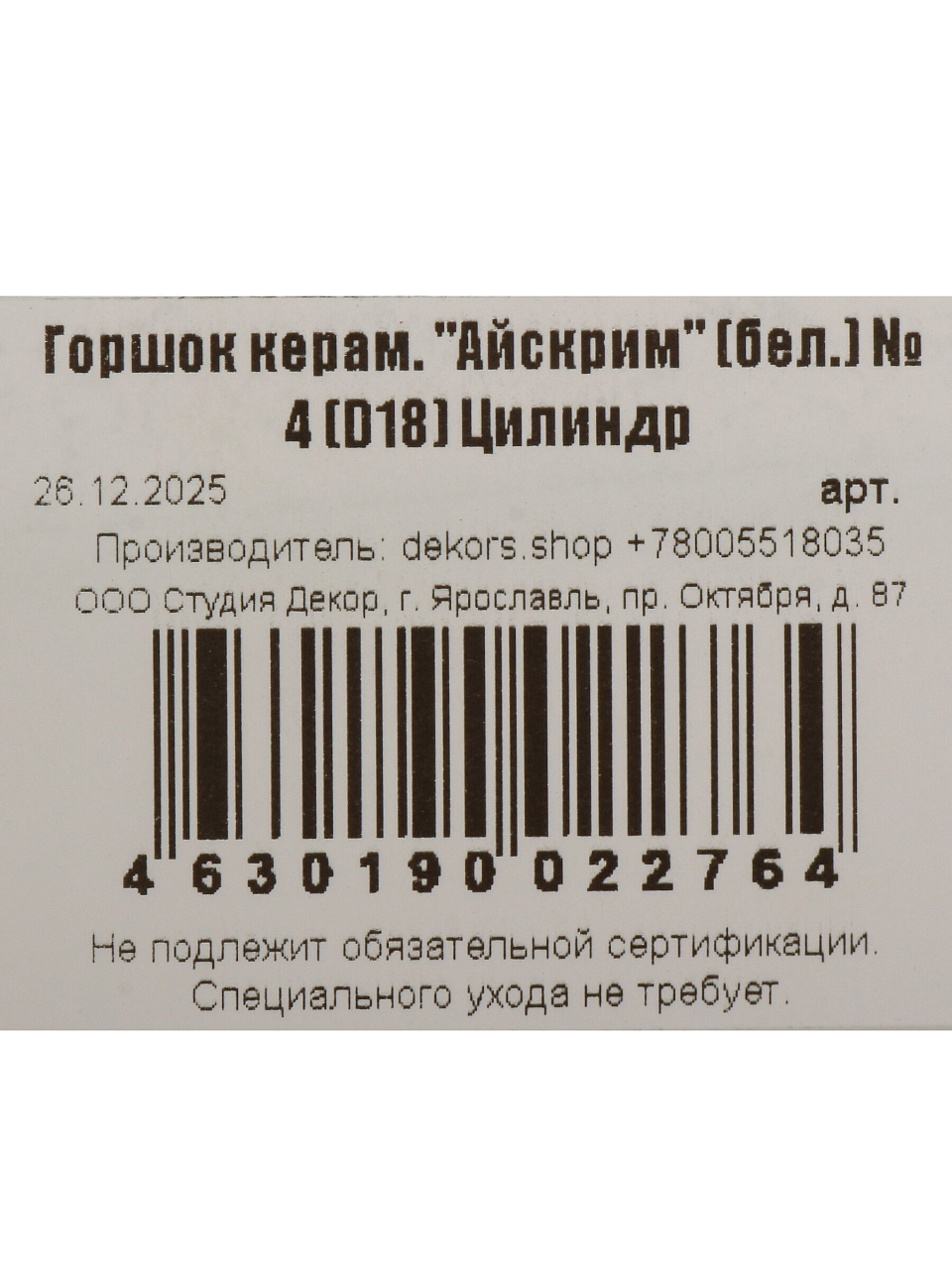 Горшок керамический 3.0 л «Айскрим №4» — стильное решение для цветоводов: белый цилиндр, долговечность, идеален для дома и дачи.