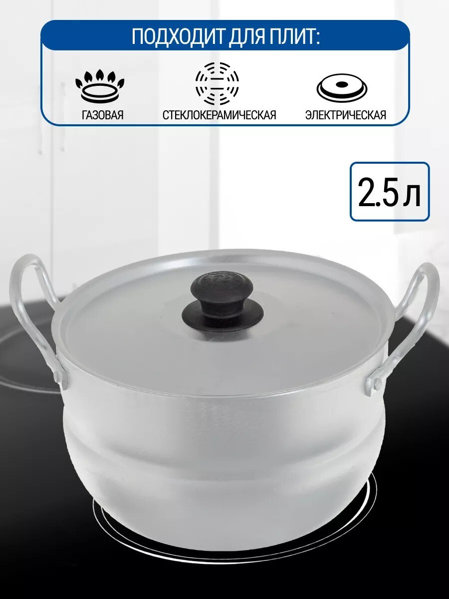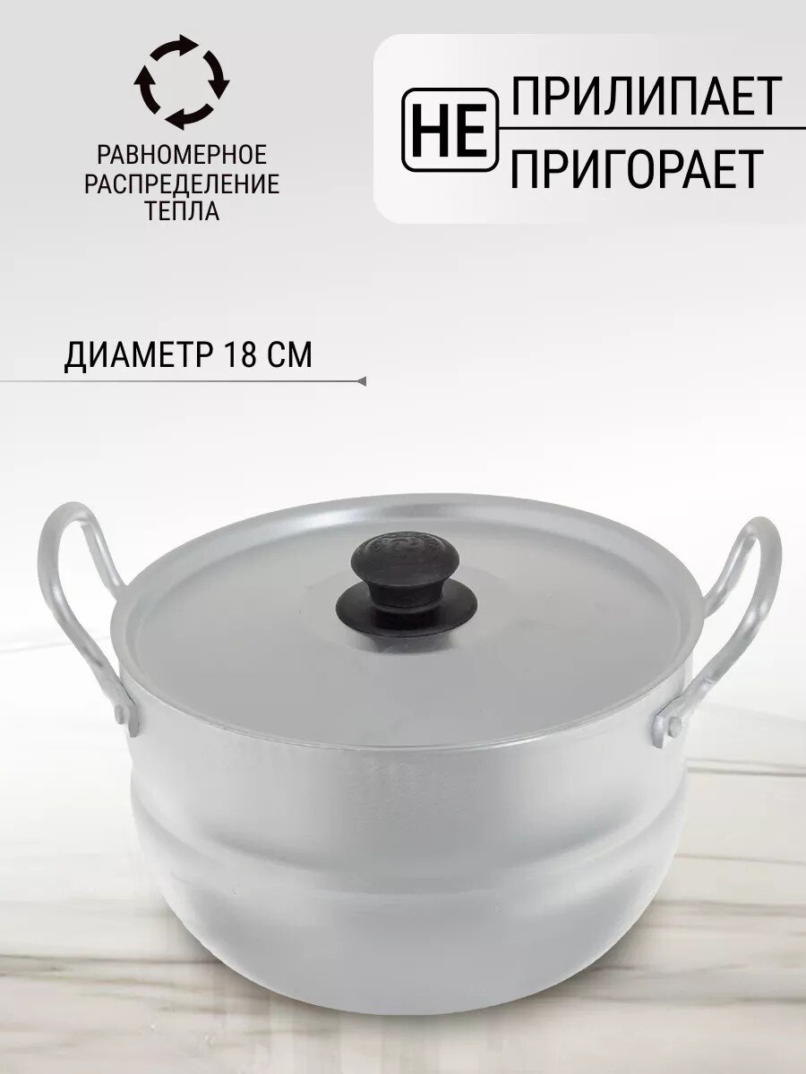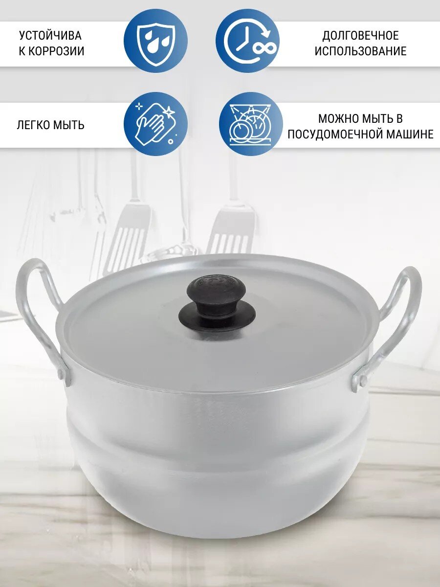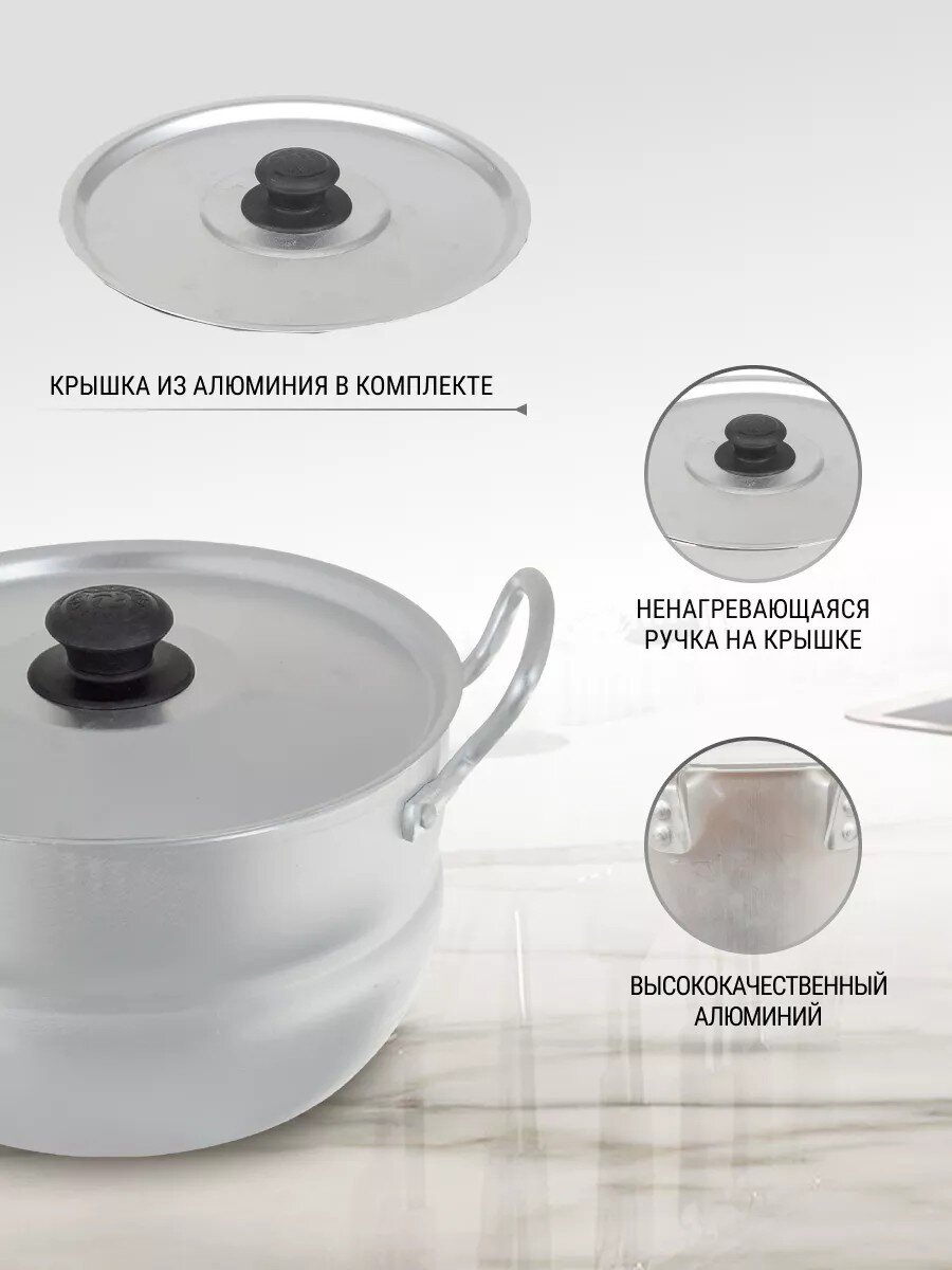 Кастрюля алюминиевая с крышкой - легкая, прочная и практичная посуда, изготовлена из пищевого алюминия, имеет высокую стойкость к коррозии, равномерно нагревается за короткий промежуток времени, проста в уходе. Качество алюминиевой посуды полностью соответствует требованиям ГОСТ 17151-81 и подтверждено многолетним и успешным спросом клиентов. Типы источников тепла: газовые и электрические плиты.