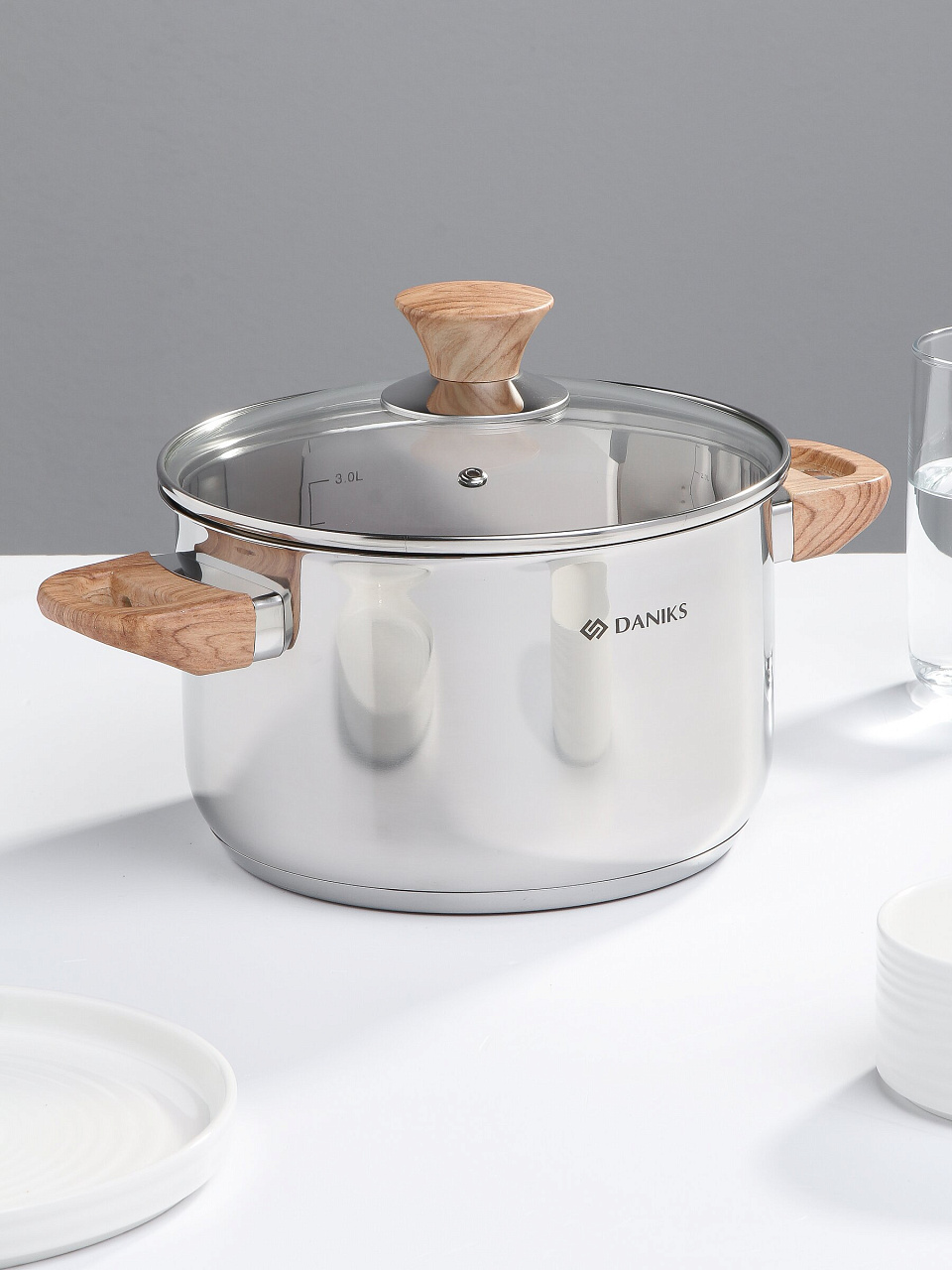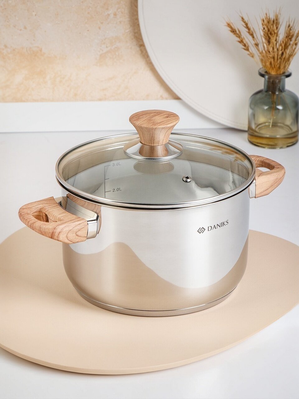 Кастрюля Daniks Осло 3.9 л из нержавеющей стали с крышкой из стекла — универсальное решение для индукционных плит, быстрая готовка без пригорания и легкий уход.