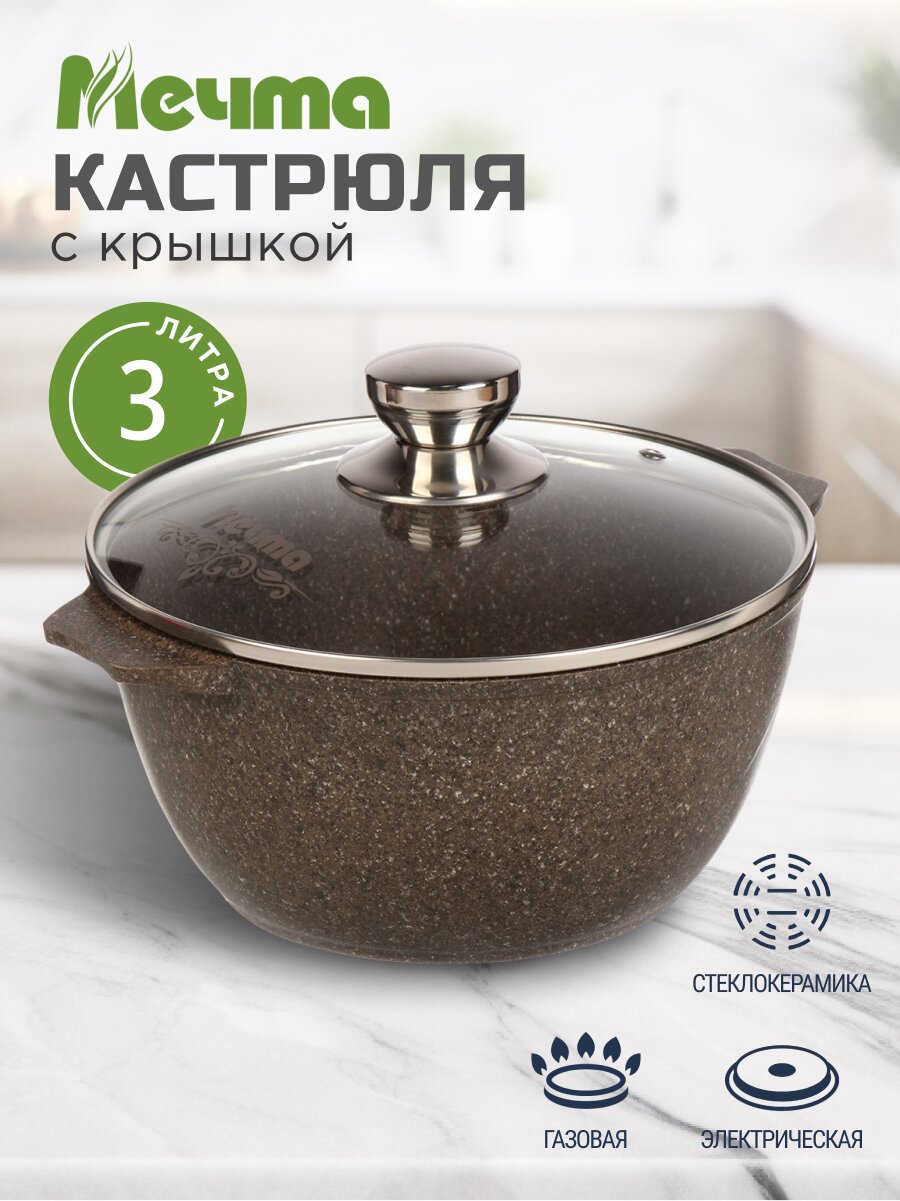 Кастрюля 3 л Мечта Premium мокко: антипригарное гранитное покрытие, толстое дно 6 мм, стеклянная крышка. Для дома, дачи и подарка — готовьте легко и без пригорания.