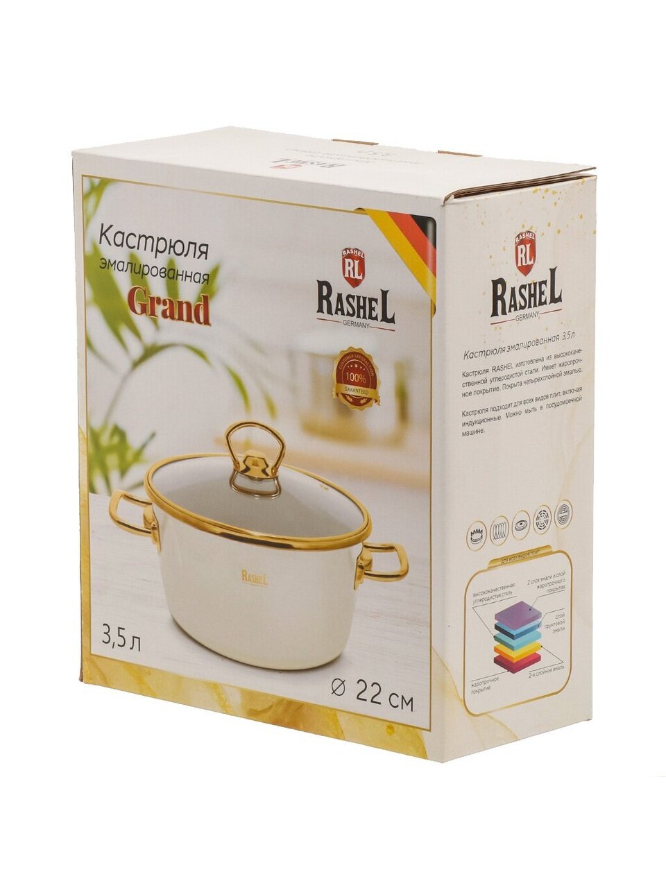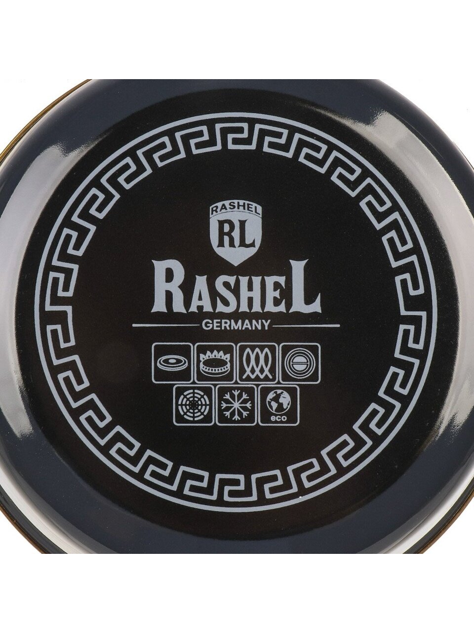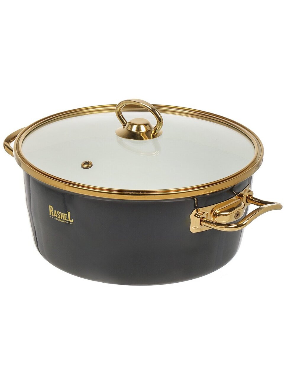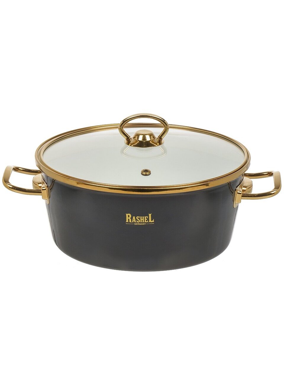Кастрюля бренда RasheL сделана из высококачественной стали с блестящим эмалированным покрытием внутри и снаружи.