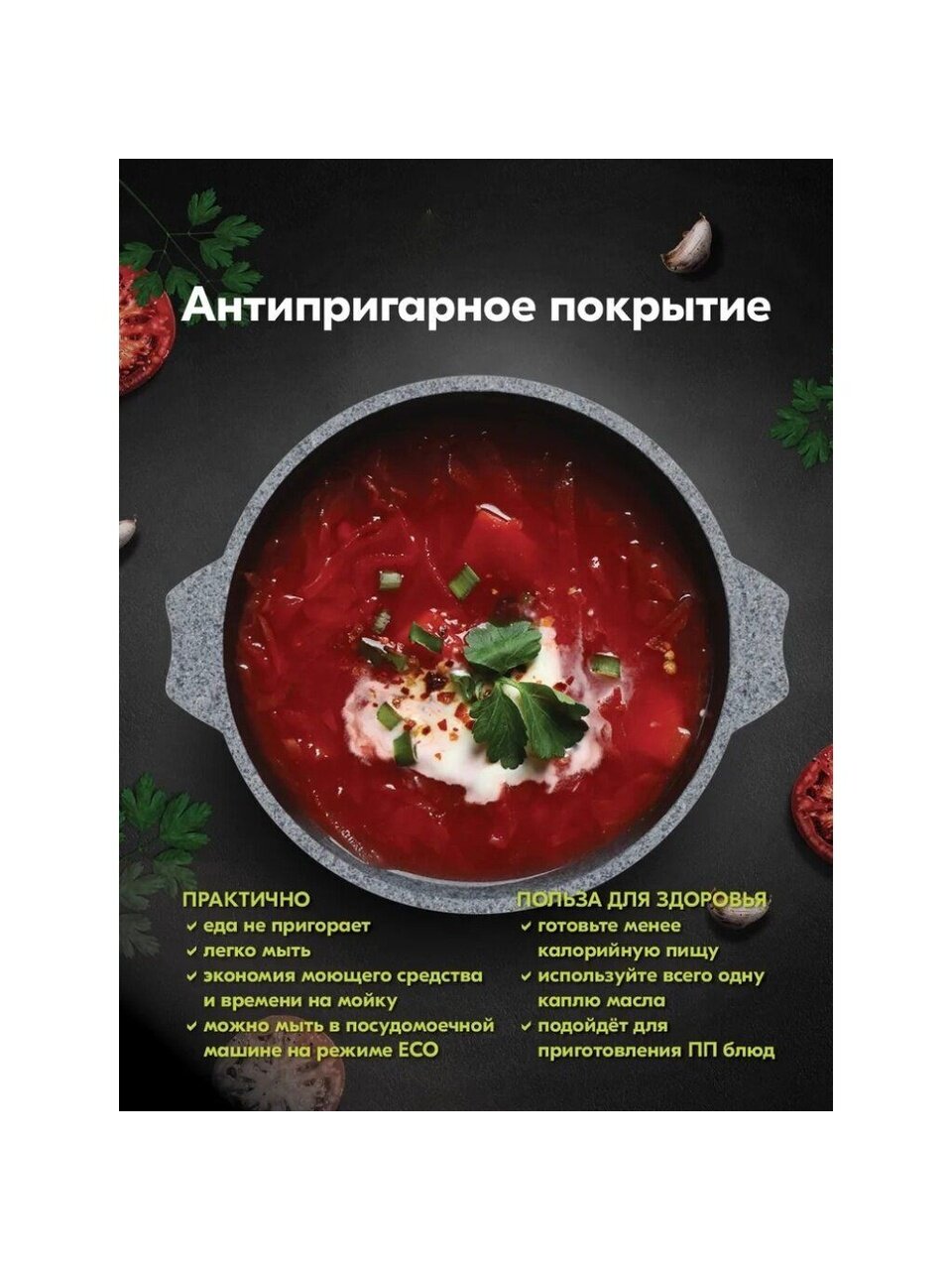 - Гранитное антипригарное покрытие: пища не пригорает, легко моется, не требует масла