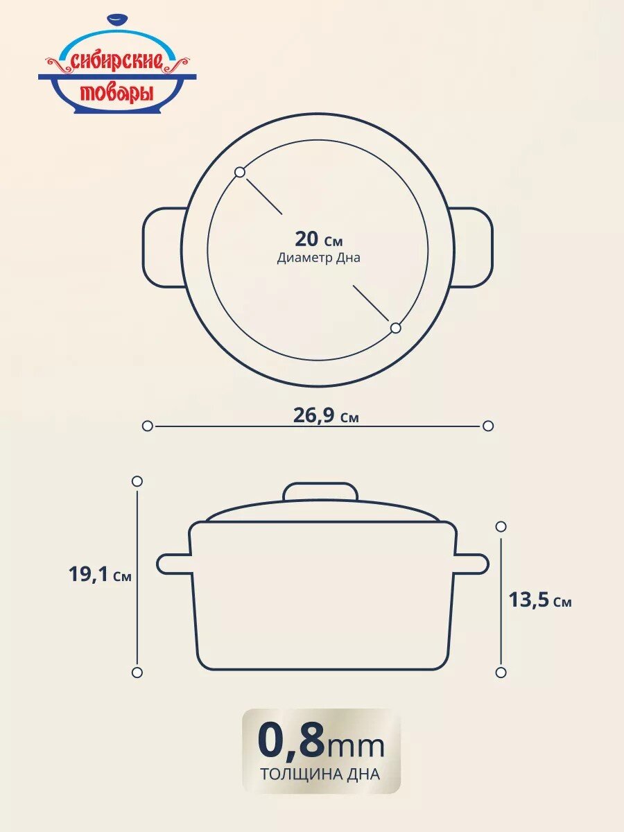 Объём — 4 литра, диаметр дна и крышки — 20 см, высота с крышкой — 19,1 см. Этого достаточно для приготовления обеда на семью или компанию.