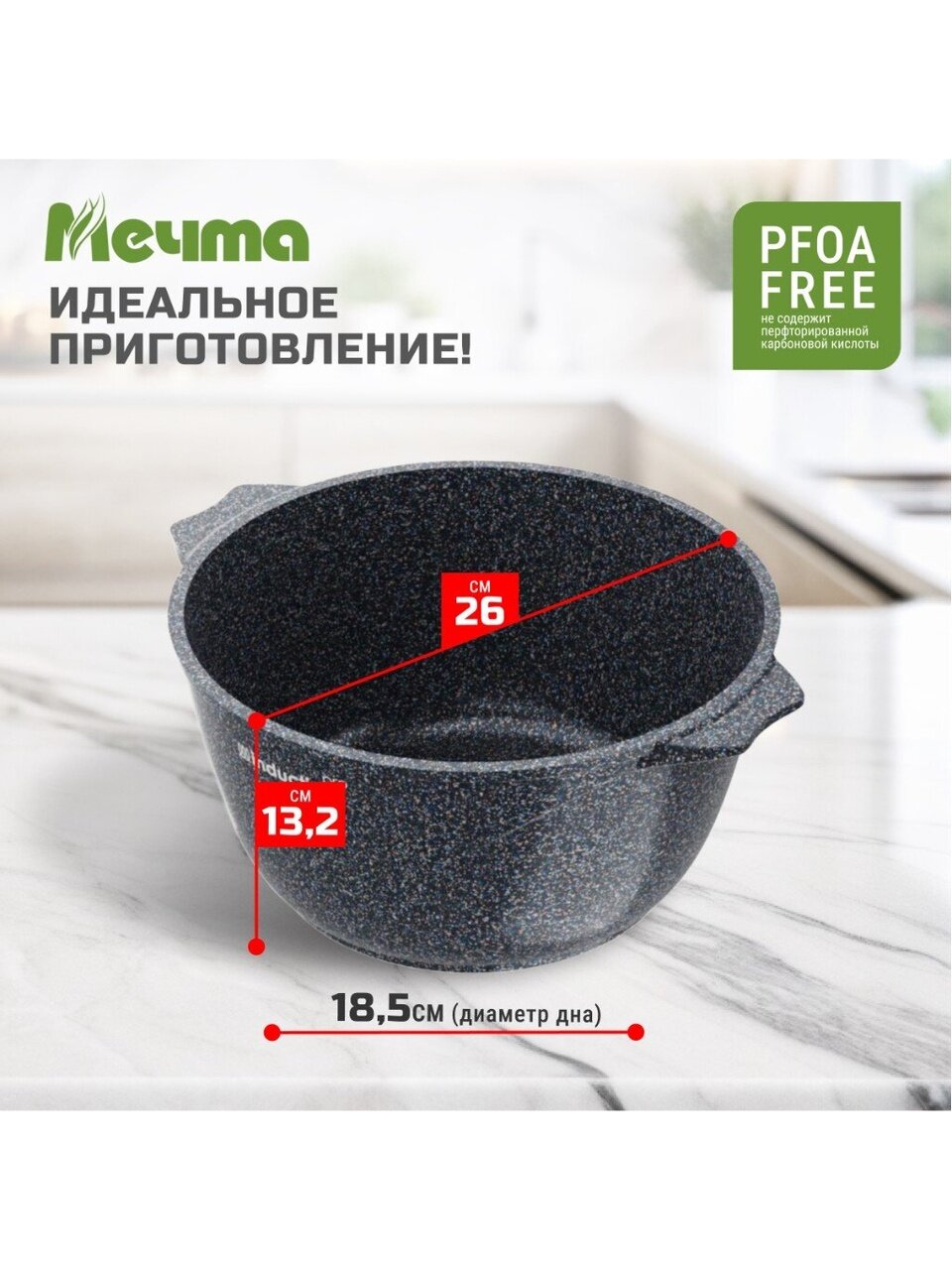 Кастрюля Мечта Гранит star Induction на 5 литров — это современный выбор для тех, кто ищет, какую кастрюлю купить для индукционной плиты или газовой поверхности. Благодаря усиленному гранитному антипригарному покрытию блюда не пригорают, а мытьё становится максимально простым. Стеклянная крышка с выпускным клапаном позволяет контролировать процесс приготовления, сохраняя вкус и аромат продуктов.