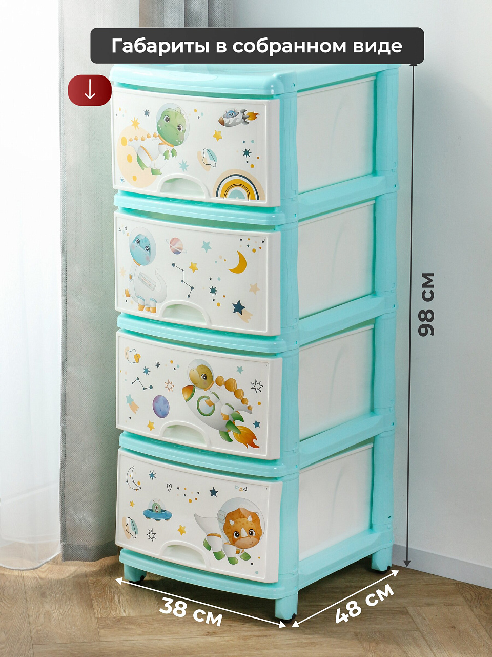 Комод укомплектован четырьмя выдвижными ящиками и ножками с колесиками. Оригинальный рисунок придется по душе каждому ребенку.