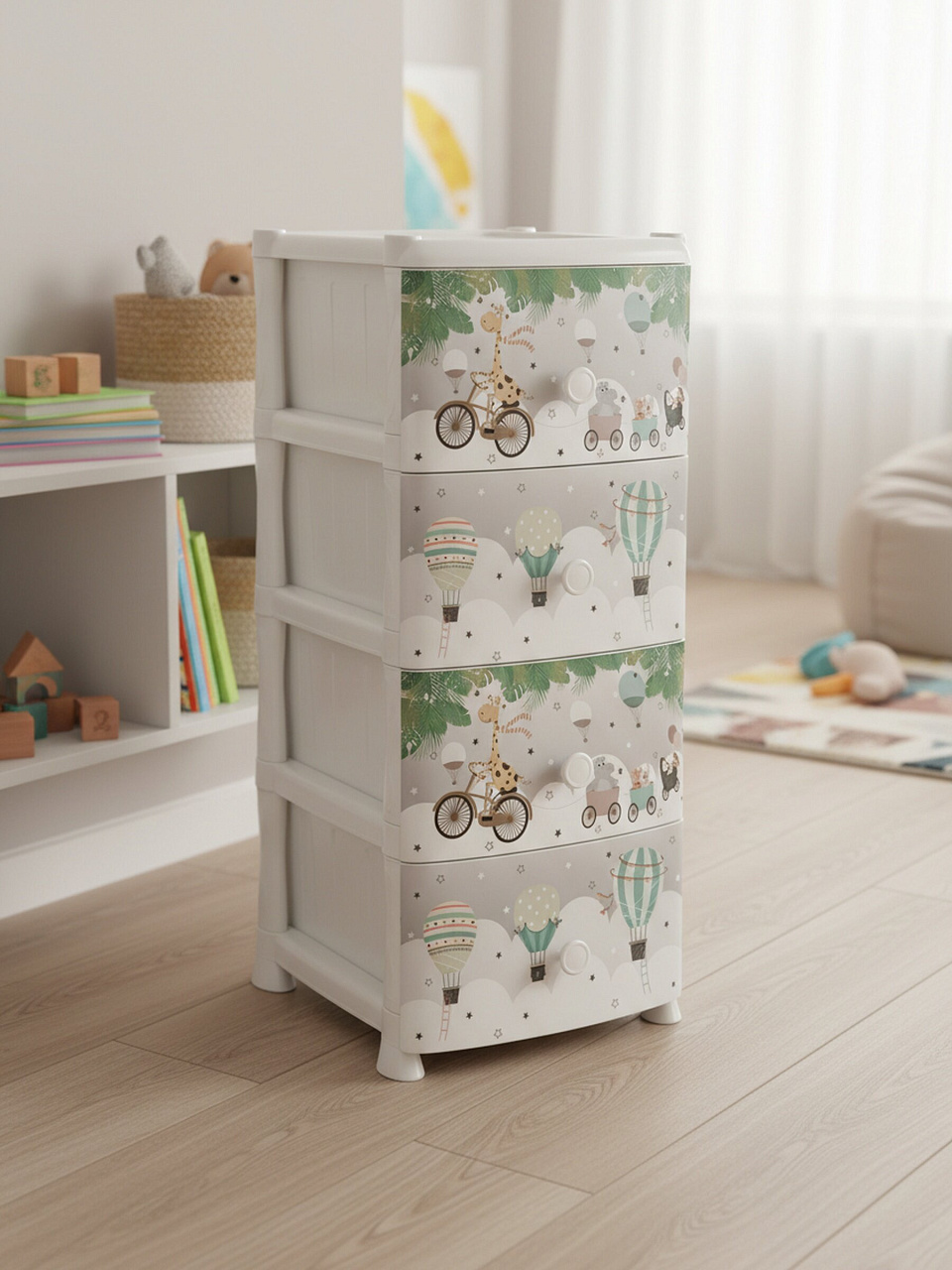 Комод Лимпопо с четырьмя ящиками предлагает идеальное сочетание вместительности и компактности. Размеры 39х47х95 см позволяют разместить его даже в небольших помещениях, а продуманная конструкция обеспечивает легкий доступ ко всем вещам. Изготовленный из высококачественного пластика, он отличается прочностью и долговечностью, что гарантирует долгий срок службы без потери внешнего вида. Отсутствие колес и дверец делает его устойчивым и безопасным для использования в доме с детьми.