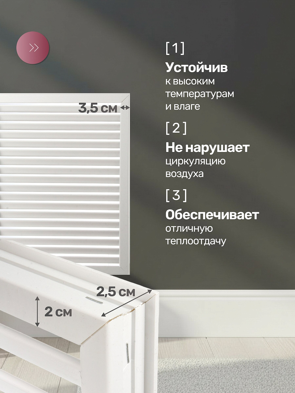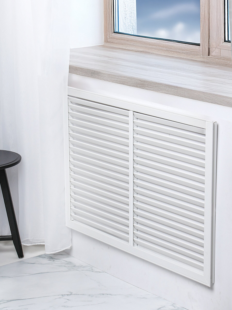 Радиаторная решетка позволяет закрыть ниши с батареями отопления, когда их внешний вид не вписывается в созданный интерьер. При этом теплый воздух будет беспрепятственно поступать в помещение через достаточное количество отверстий в жалюзи.