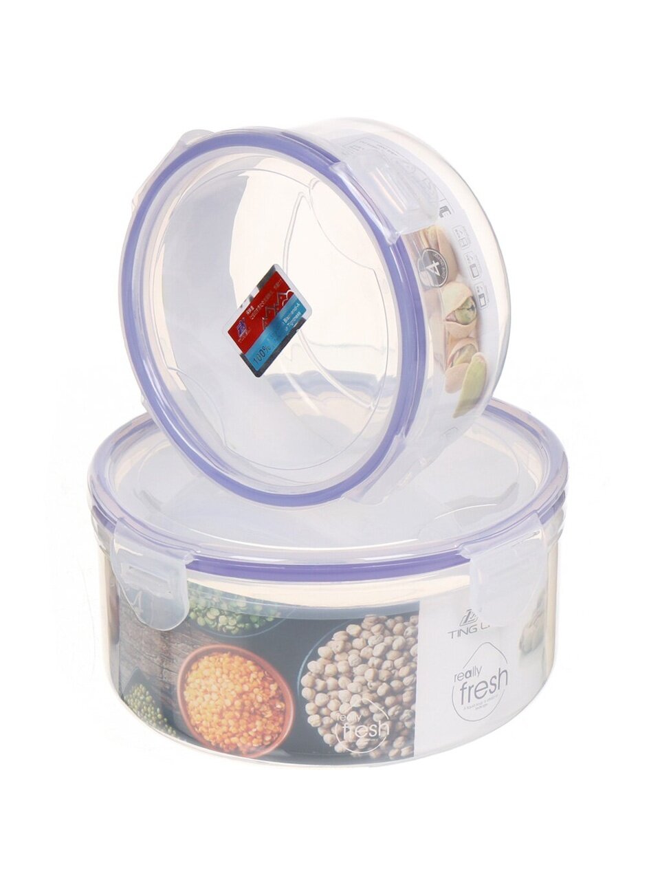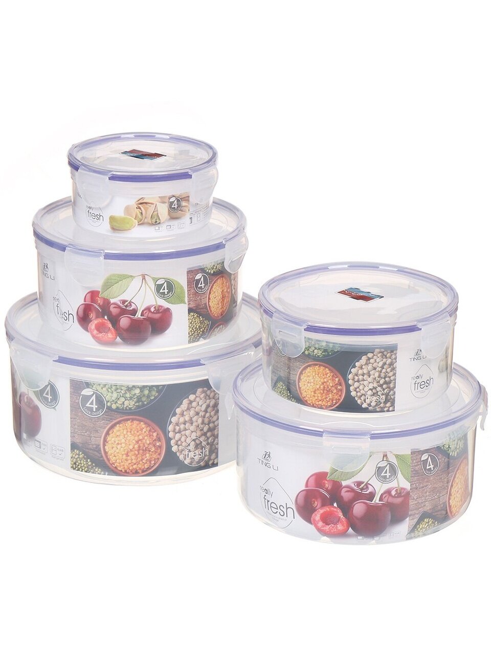 В наборе 5 контейнеров объёмом 3300, 2000, 1400, 900 и 450 мл. Все контейнеры круглой формы, прозрачные, с герметичными крышками на защёлках.