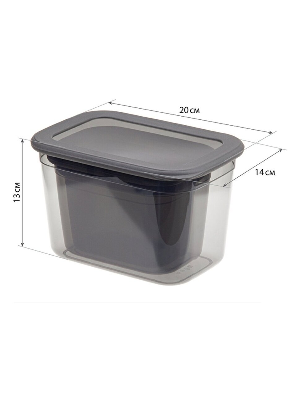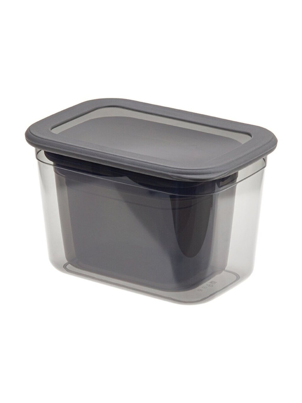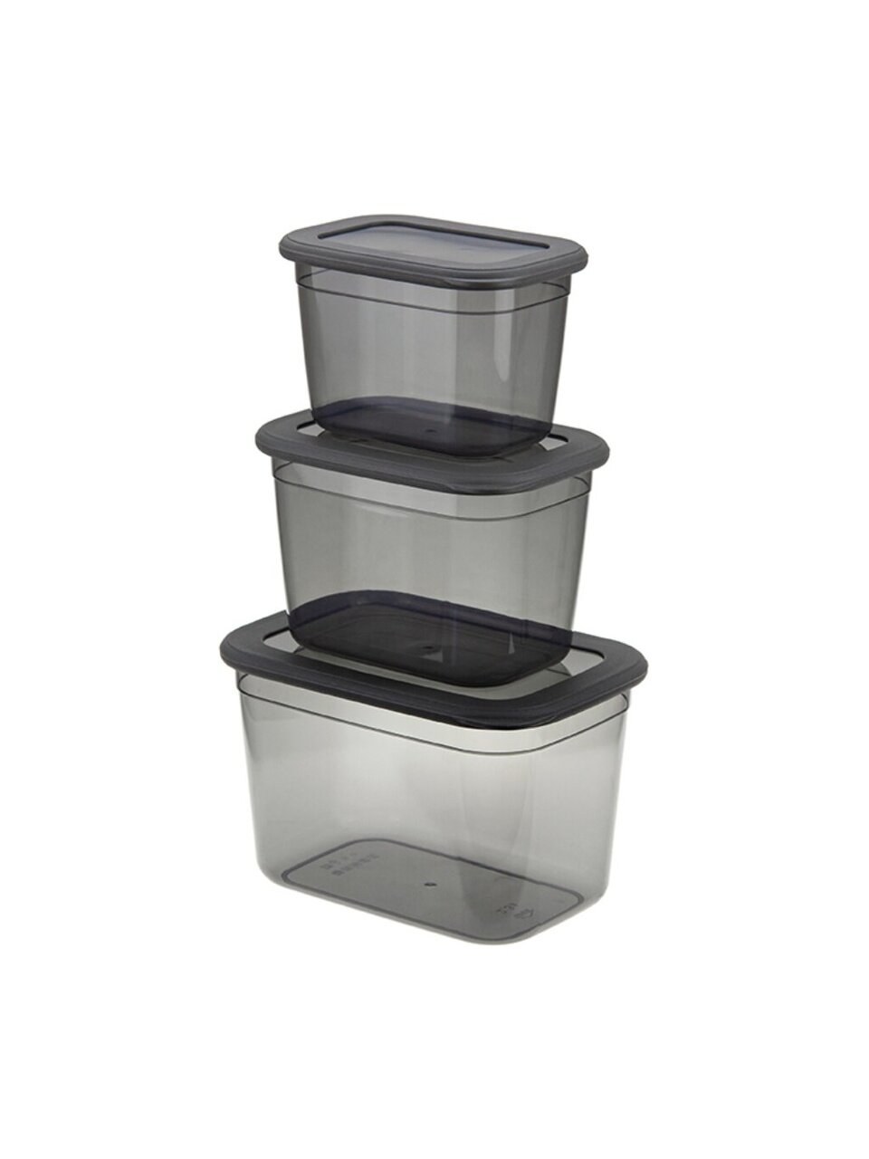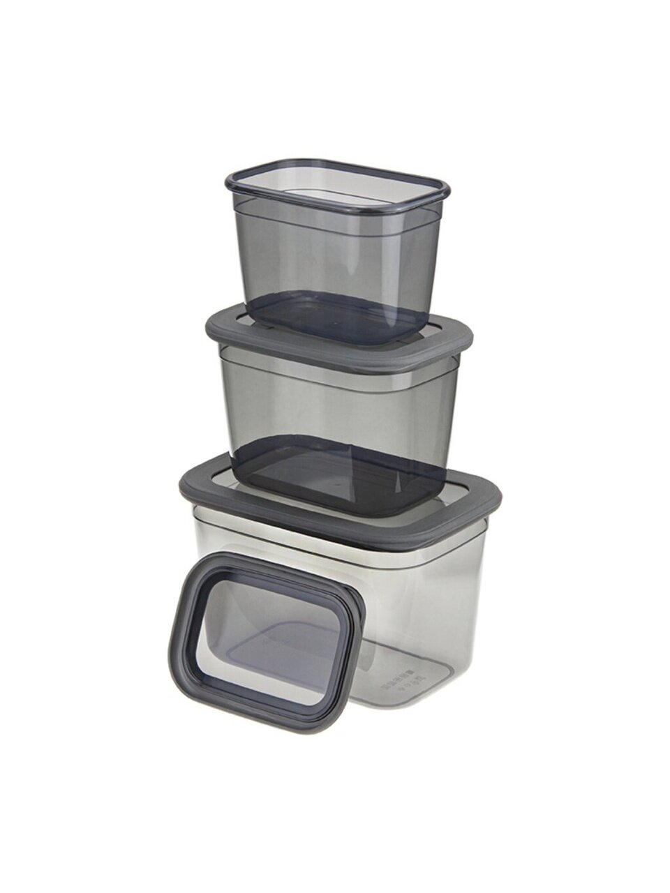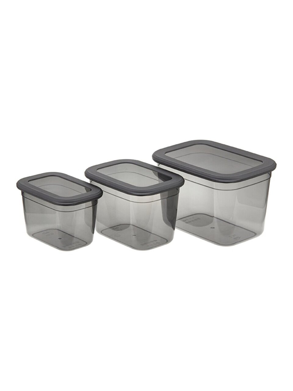 В наборе три контейнера: 0.8 л, 1.3 л и 2.3 л, все с герметичными крышками, материал — пластик, цвет — графитовый, можно мыть в посудомоечной машине.
