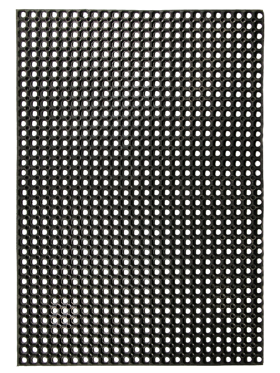 Коврик имеет сквозные отверстия, благодаря которым вода и грязь легко проходят сквозь него, обеспечивая чистоту и сухость поверхности. Прямоугольная форма и классический черный цвет позволят ему гармонично вписаться в любой экстерьер, подчёркивая стиль и практичность вашего дома.