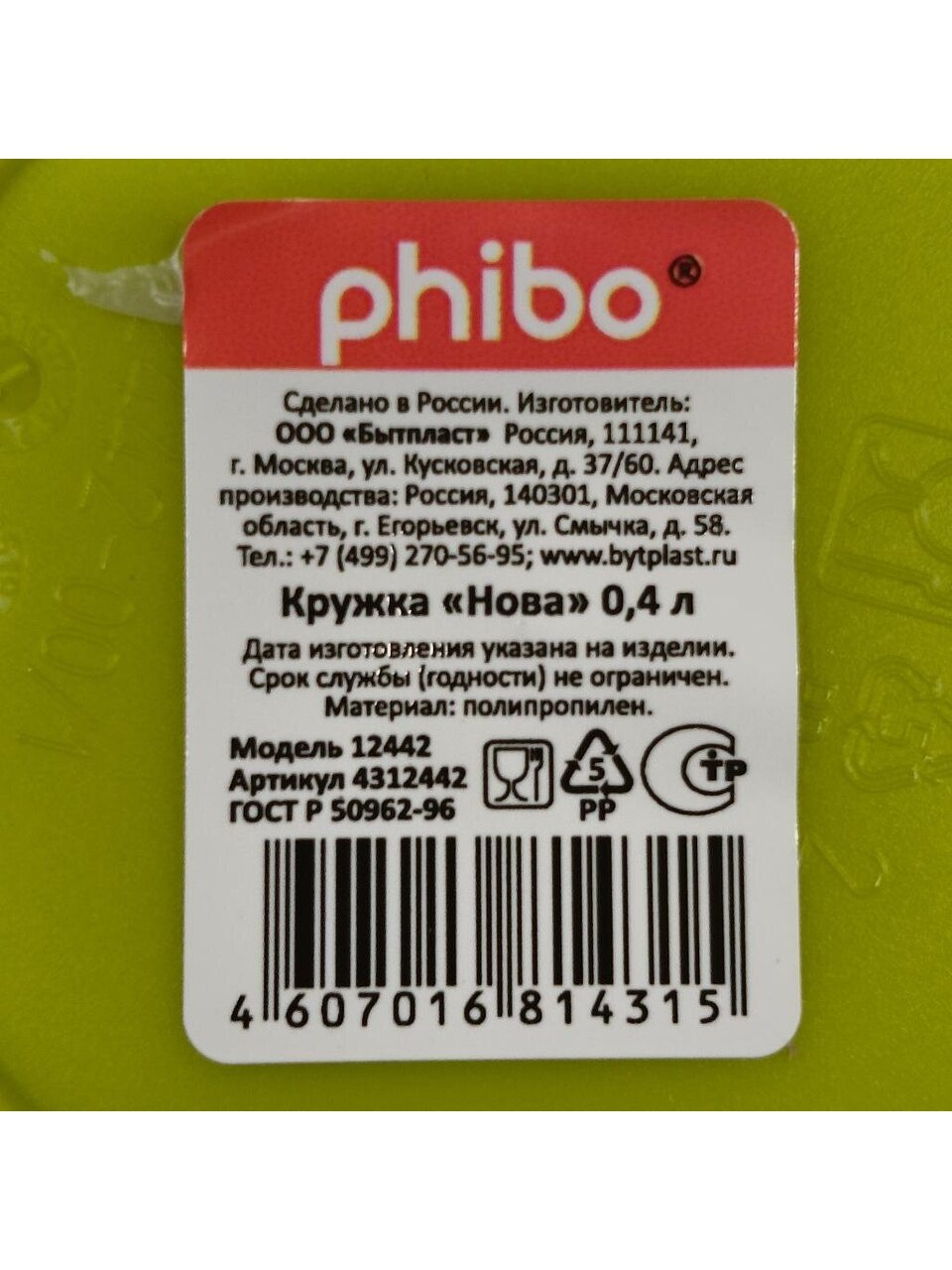 Практичная пластиковая кружка Phibo Нова 400 мл — универсальное решение для дома, дачи и офиса: легкая, прочная, подходит для СВЧ и посудомоечной машины.