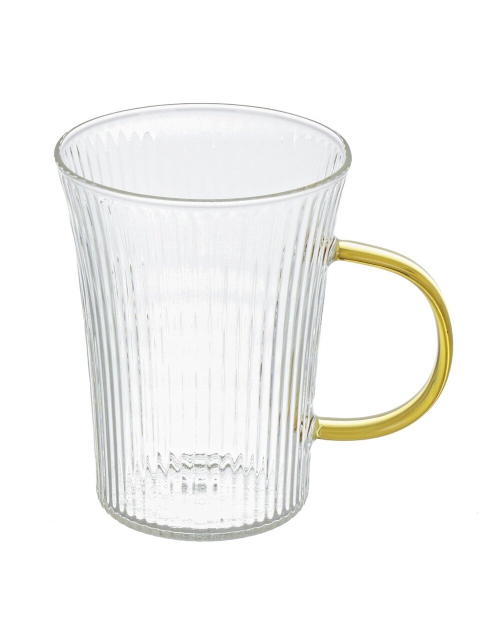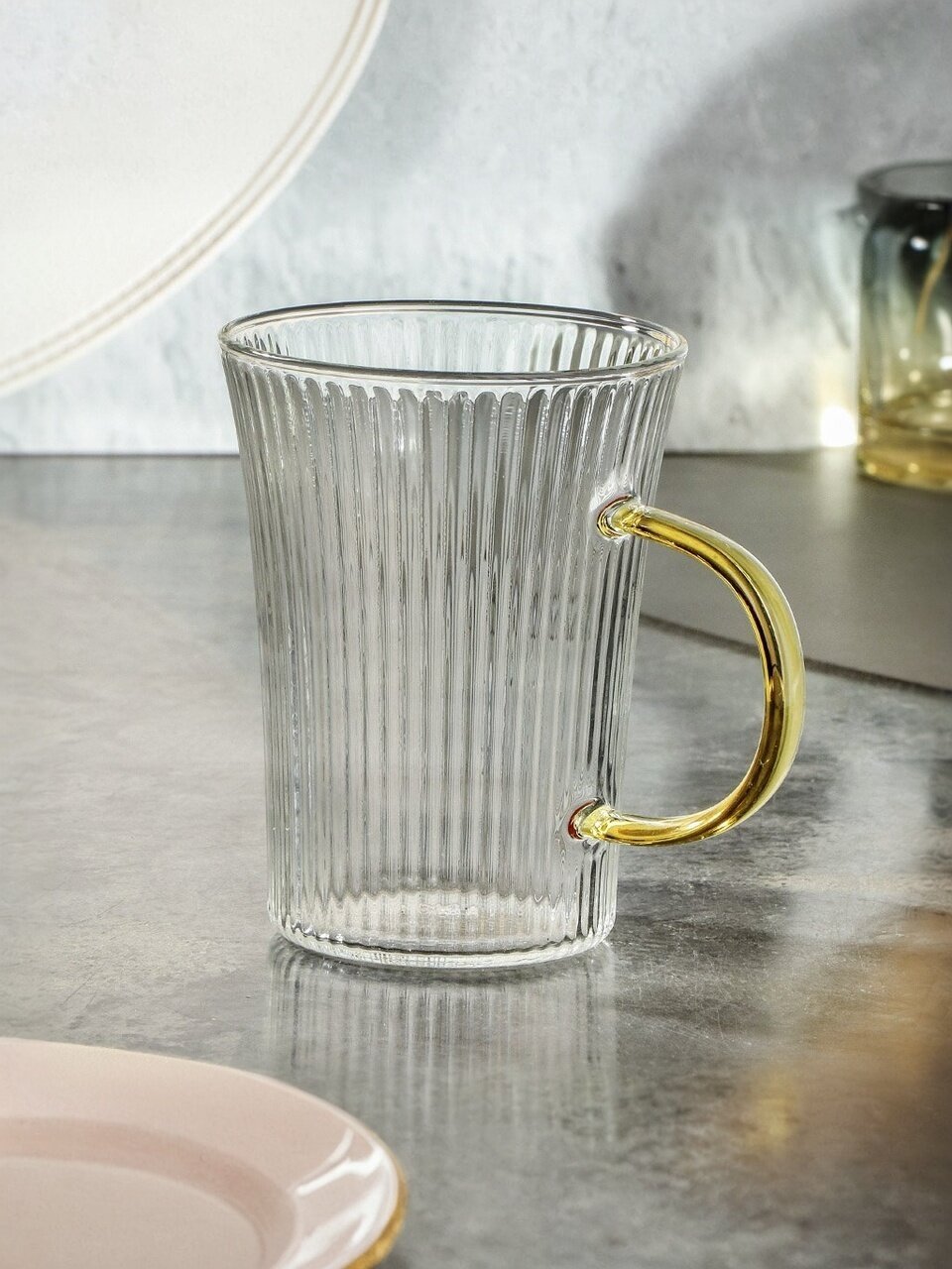 Погрузитесь в элегантность и стиль с рифленой стеклянной кружкой объемом 320 мл, украшенной изысканной золотой ручкой. Эта кружка станет не только практичным аксессуаром для вашего дома, но и утонченным элементом декора.