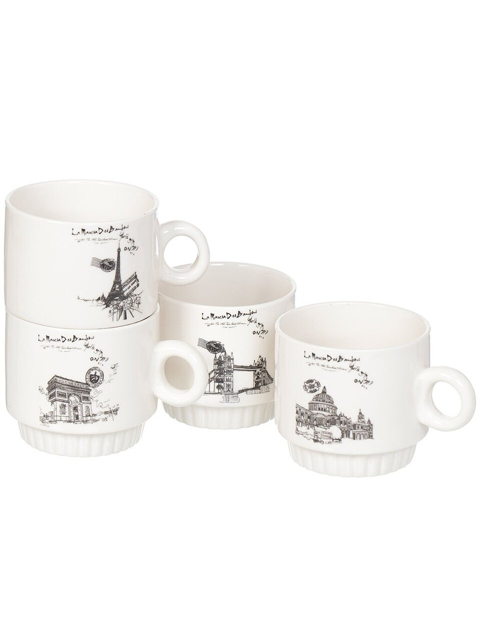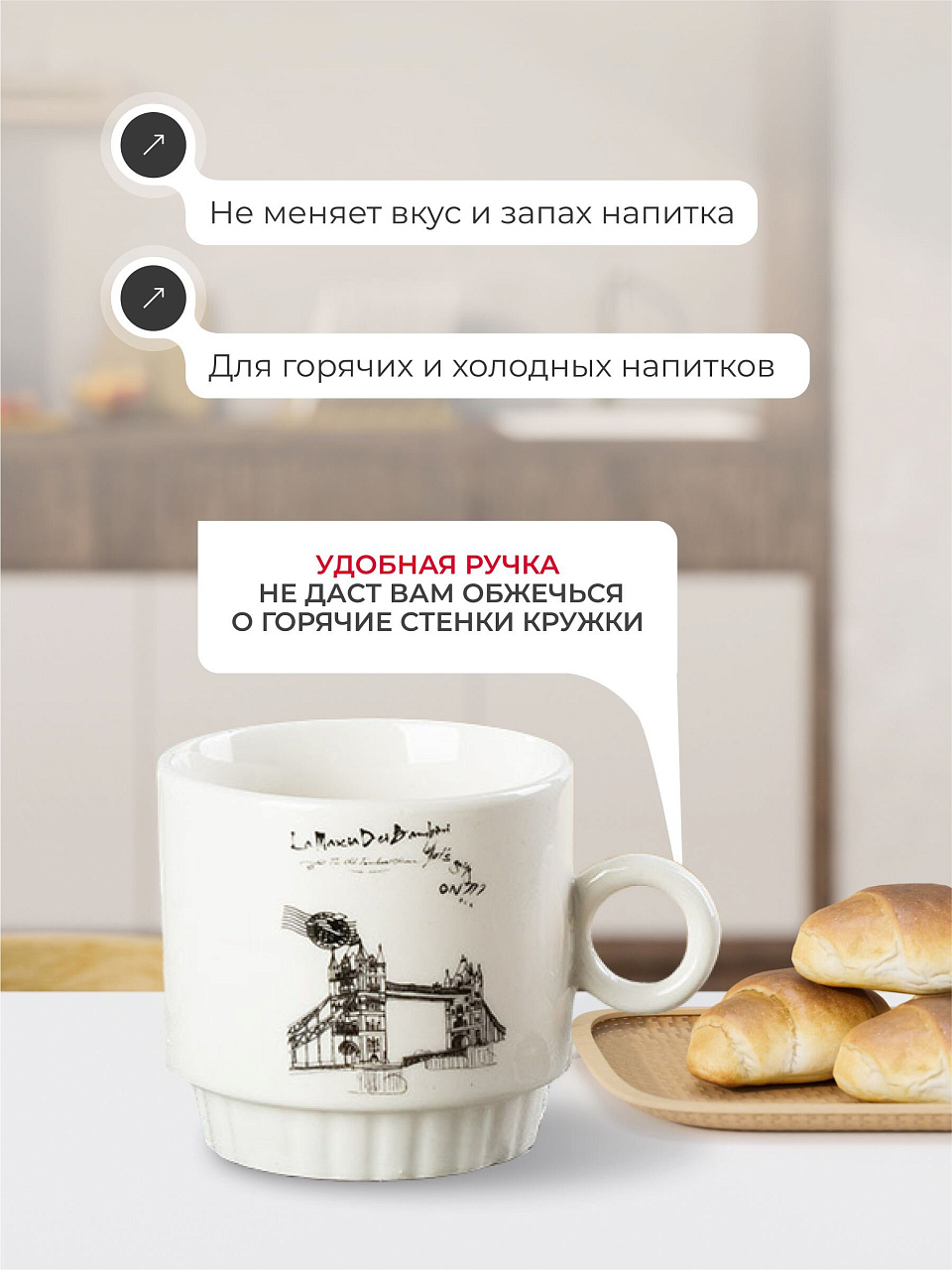 Многие спрашивают: подходит ли этот набор для микроволновки и посудомоечной машины? Да, можно использовать в СВЧ и мыть в ПММ — это экономит время и облегчает уход. Металлическая подставка помогает аккуратно разместить кружки на кухне или в офисе, а лаконичный белый цвет и современный принт «города» впишутся в любой интерьер.