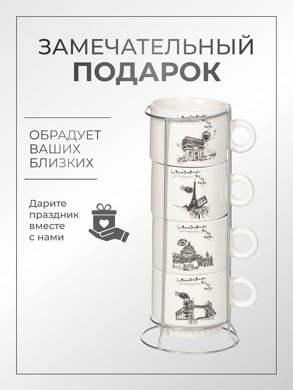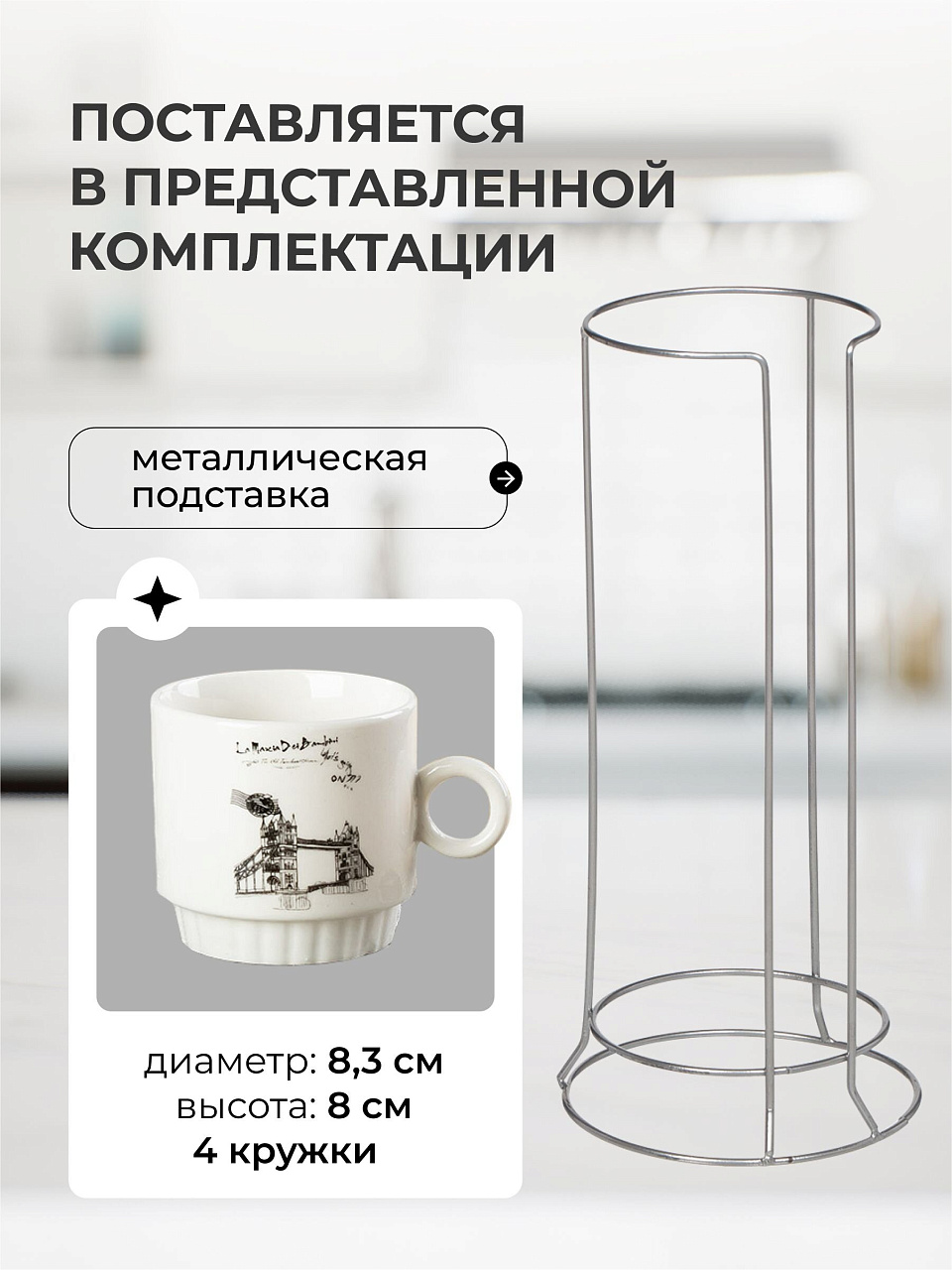 - Удобная металлическая подставка: храните 4 кружки компактно и всегда под рукой