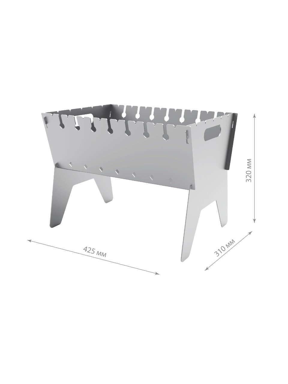 Размер: 425х310х320 мм, оптимально для 6-8 шампуров. Толщина стали 2 мм обеспечивает надежность даже при полной загрузке.