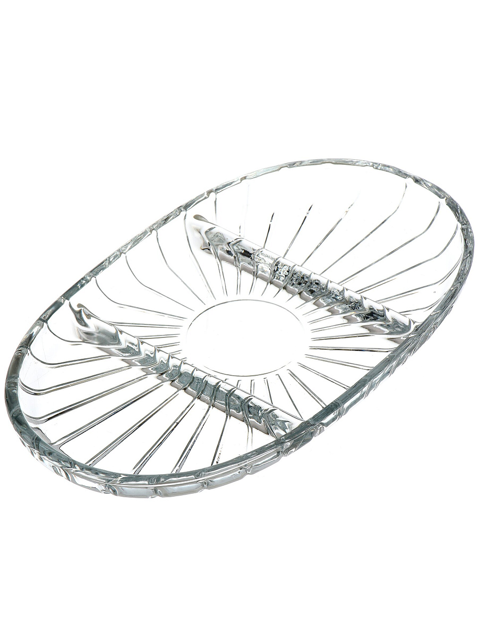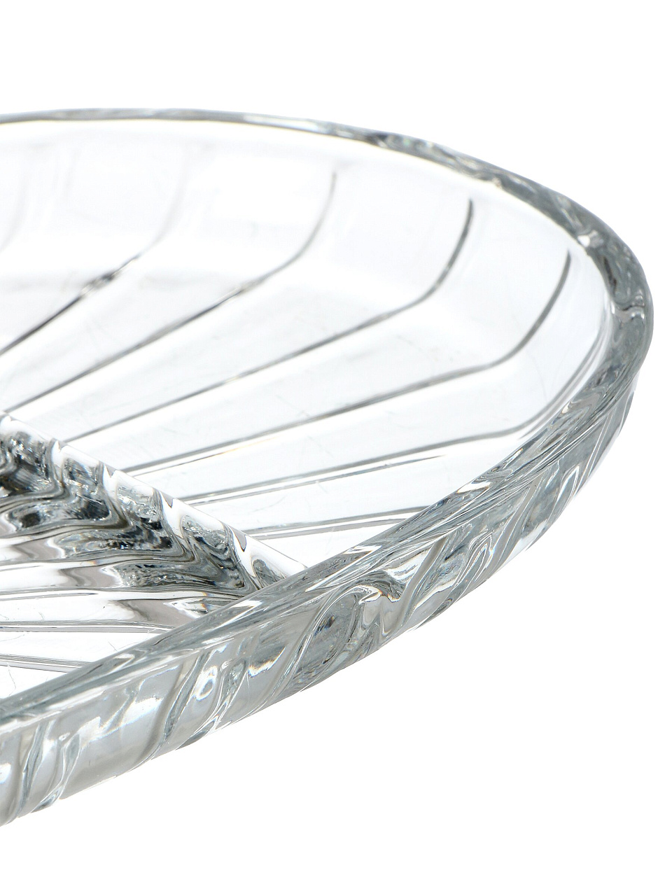 Менажница выполнена из прозрачного стекла, не имеет отдельной подставки — это облегчает уход и экономит место на столе.