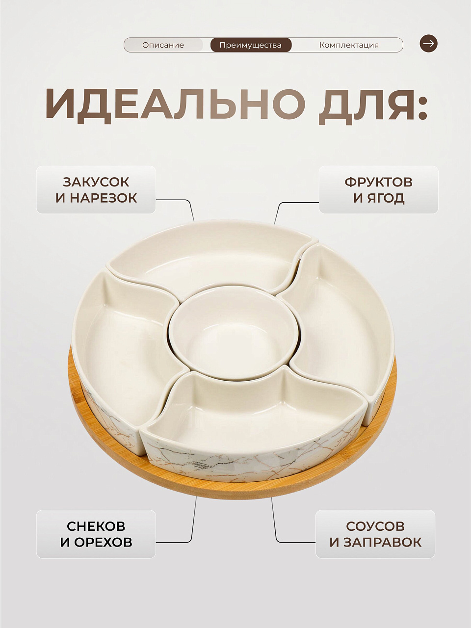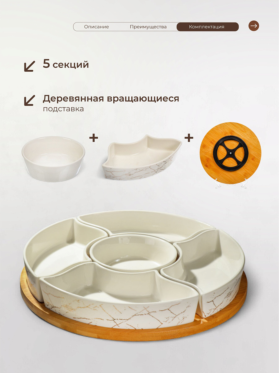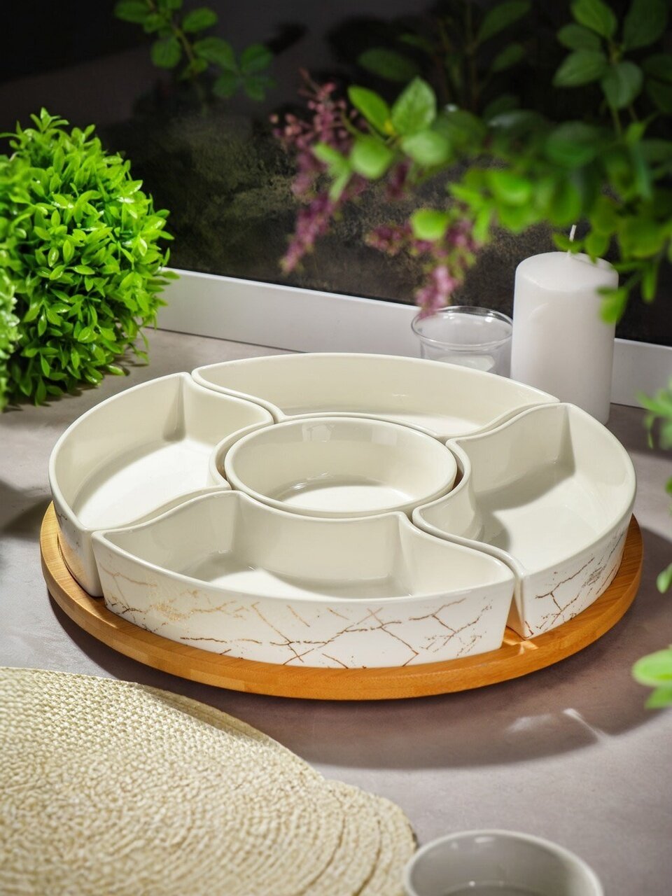 Вы можете приобрести «Менажница керамика, 30 см, 5 секций, бамбуковая подставка, Белый мрамор с золотом, Y4-6601» и другие товары в нашем интернет-магазине в Серпухове по низким ценам и с бесплатным самовывозом.