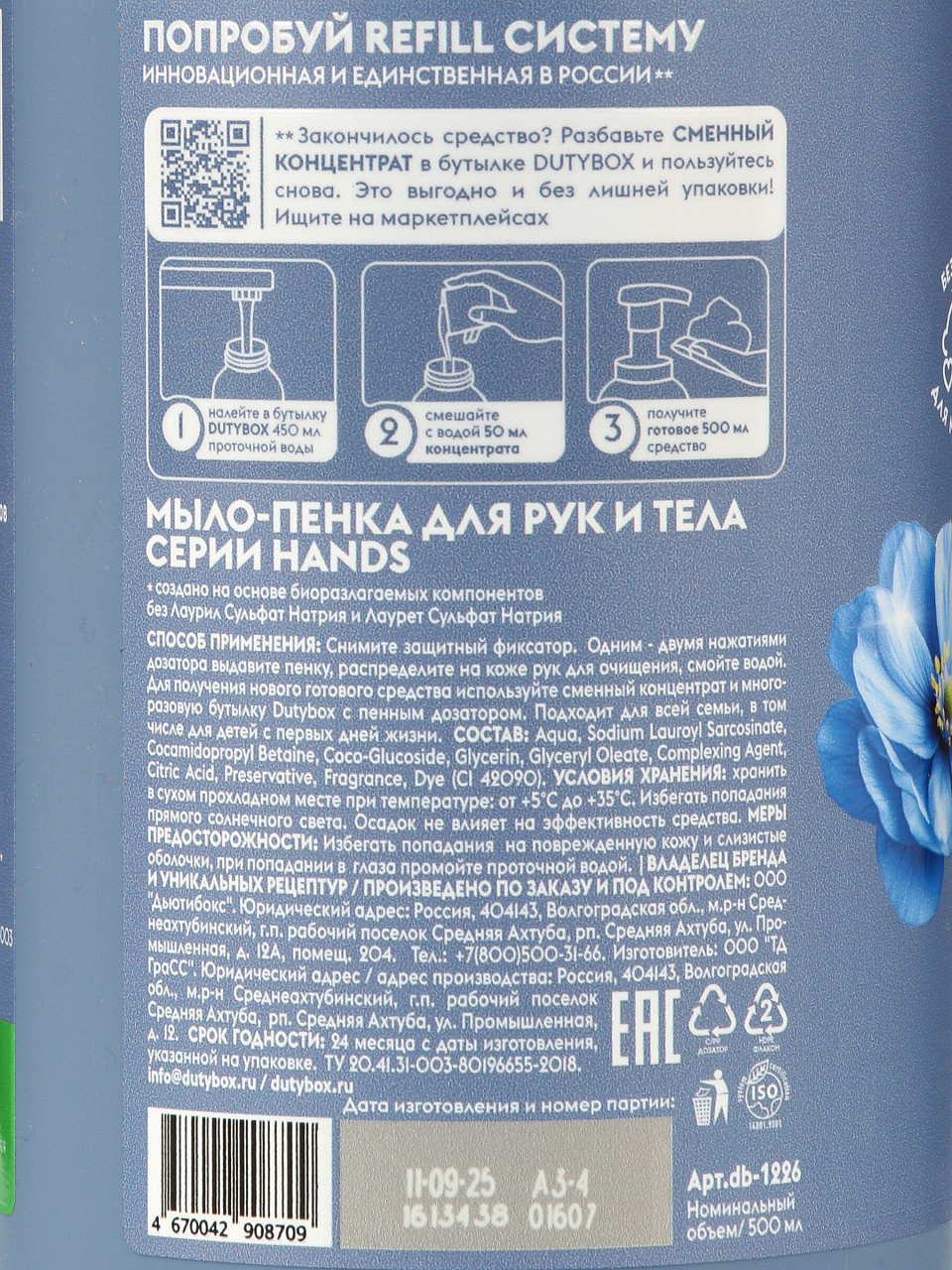 Мыло-пенка Dutybox «Хлопок и Дамасская роза», 500 мл: деликатное очищение, гипоаллергенный состав, бережная забота о коже всей семьи без пересушивания.