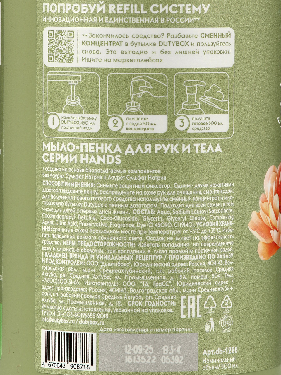 В отличие от обычных жидких мыл, Dutybox образует плотную пену, что снижает расход и экономит семейный бюджет. Флакон 500 мл — это в 2 раза больше стандартного объёма, что делает покупку выгодной для дома, дачи или офиса. Часто спрашивают: «подходит ли для кухни» — да, пенка Dutybox эффективно удаляет запахи и не оставляет пленки на коже.
