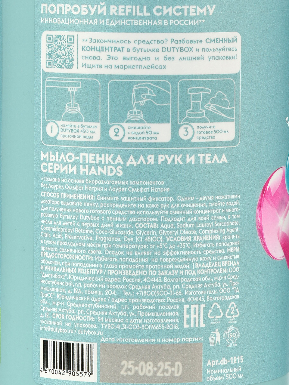 Часто спрашивают, чем отличается мыло-пенка от обычного жидкого мыла? Пенка быстрее распределяется, образует воздушную текстуру и снижает расход, что особенно выгодно для большой семьи или офиса. По объёму Dutybox выгодно отличается от аналогов — 500 мл хватает в среднем на 400 применений.