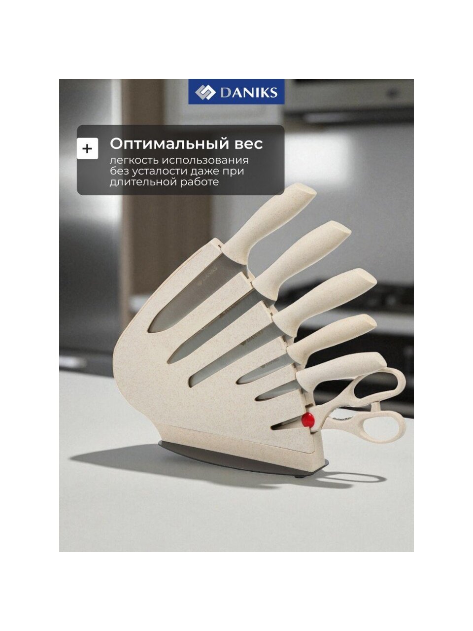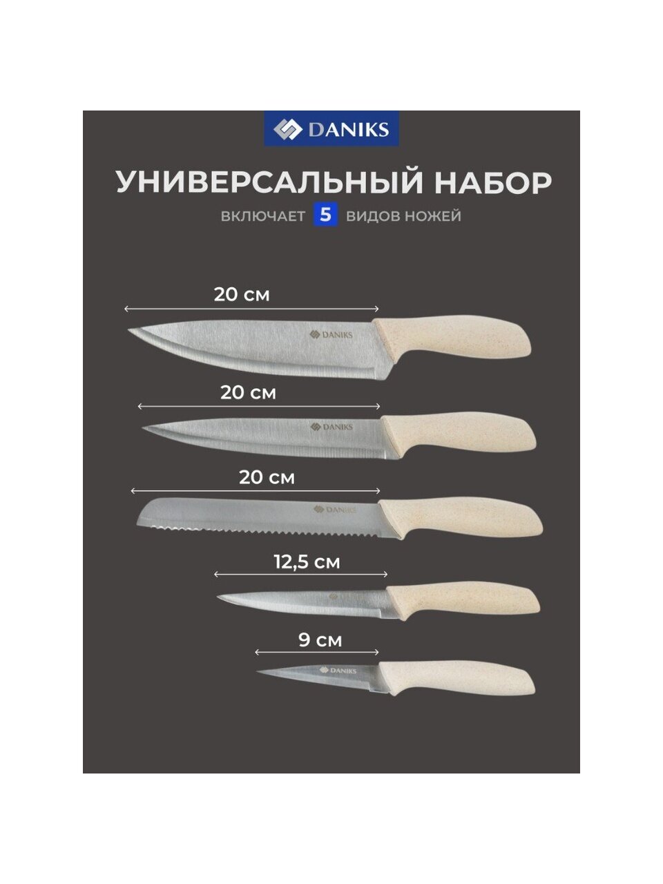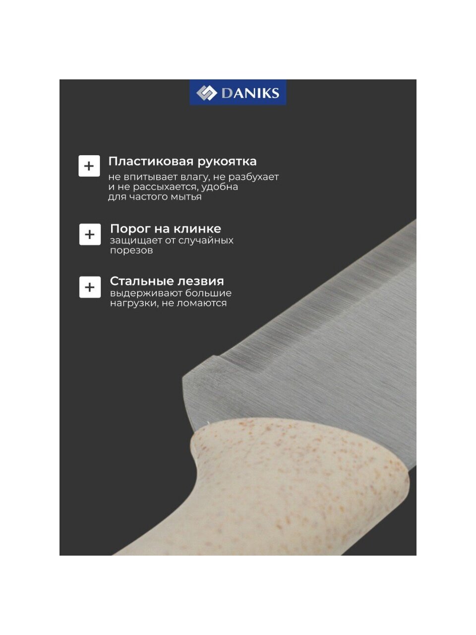 Набор включает шеф-нож, нож для овощей, универсальный нож, хлебный нож, разделочный нож и ножницы — оптимальный выбор для приготовления различных блюд. Продукция бренда Daniks отличается надежностью и практичностью, что подтверждается высокой популярностью среди покупателей товаров для дома и дачи.