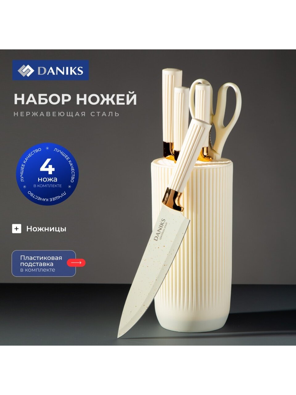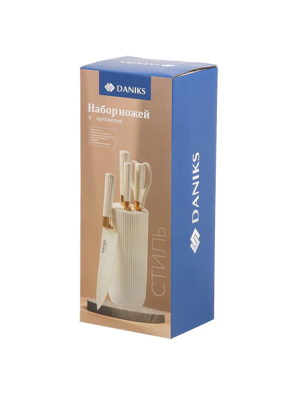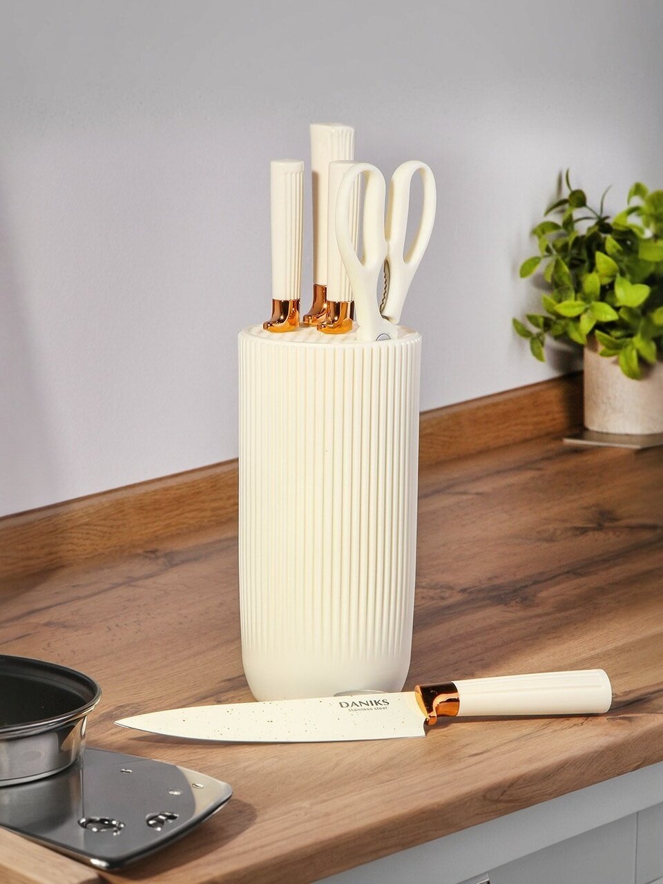 Набор ножей 6 предметов Daniks, модель Стиль YW-A455 – идеальный выбор для современной кухни, где ценятся качество, удобство и стильный внешний вид. Комплект включает четыре ножа с лезвиями из прочной нержавеющей стали, ножницы и функциональную подставку. Привлекательный белый цвет гармонично впишется в любой интерьер и подчеркнет чистоту рабочей зоны. Кухонные ножи Daniks легко справляются с нарезкой овощей, мяса и других продуктов, обеспечивая точность и комфорт при каждом использовании. Эргономичные пластиковые рукоятки надежно лежат в руке, не скользят и не впитывают запахи, что особенно важно для ежедневного применения. Благодаря возможности мытья в посудомоечной машине уход за набором становится максимально простым.